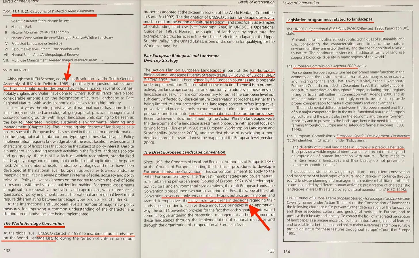 Όσο για τα τοπία... η IUCN έχει γράψει εκτενώς για το θέμα, από το «Πολιτιστικά τοπία και προστατευόμενες περιοχές: Unfolding the linkages and synergies» [17], μέσω του «Συνδέοντας τοπία: Εξερεύνηση των σχέσεων μεταξύ των πολιτιστικών τοπίων της Παγκόσμιας Κληρονομιάς και των προστατευόμενων περιοχών της IUCN» [18]... αλλά ενώ το ίδιο το »τοπίο” αναφέρεται απλώς σε μια αυθαίρετη γεωγραφική περιοχή, αυτό που έχει πραγματική σημασία εδώ είναι ότι κάθε ένα από αυτά μπορεί κάλλιστα να ταξινομηθεί ως προστατευόμενο, όπου η IUCN το 1994 περιέγραψε τους διάφορους τύπους προστατευόμενων περιοχών, τις κατηγορίες και τους τύπους διαχείρισης - αν και η συγκεκριμένη έκδοση παρακάτω είναι μια περαιτέρω αναπτυγμένη έκδοση του 2008 [19].