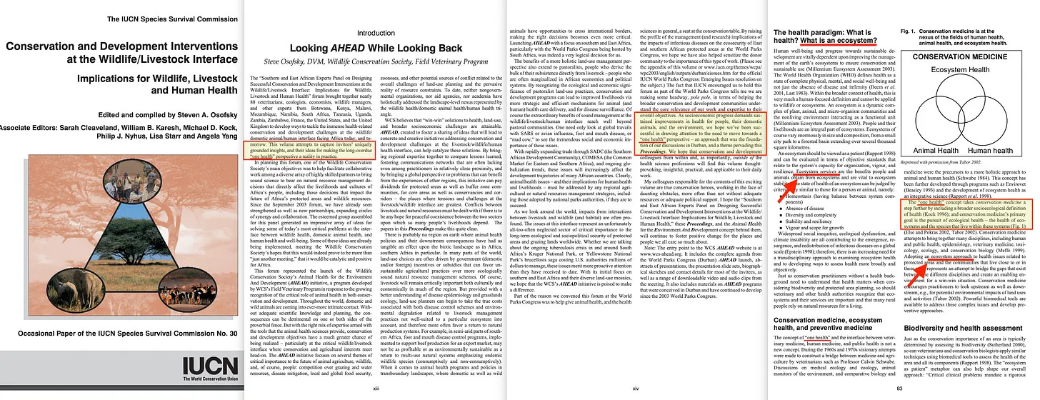 Οι πρωτοβουλίες αυτές είναι τόσες πολλές και καλύπτουν σχεδόν όλους τους τομείς της διατήρησης, που δεν θα μπορούσαμε καν να ελπίζουμε ότι θα τις εξετάσουμε όλες [27]. Ας κάνουμε λοιπόν ένα βήμα στο χρόνο, πρώτα στο 2003, και στην εκδήλωση της IUCN στην οποία χρησιμοποιήθηκε για πρώτη φορά ο όρος «Ενιαία Υγεία-One Health» [28] , με τις πρόσθετες έννοιες «Οικοσυστημική προσέγγιση» και «Οικοσυστημικές υπηρεσίες».