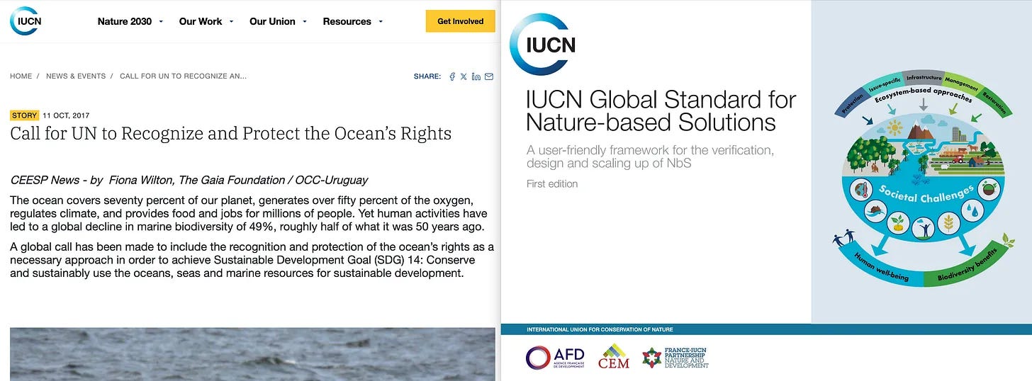 Έχουμε επίσης το 2020 το «Παγκόσμιο πρότυπο της IUCN για λύσεις βασισμένες στη φύση» [23], και το 2017 την «Έκκληση προς τα Ηνωμένα Έθνη να αναγνωρίσουν και να προστατεύσουν τα δικαιώματα του ωκεανού» [24] με... το Ίδρυμα Γαία...