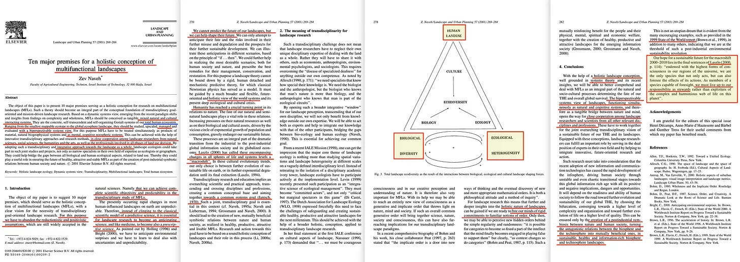 Ο Zev Naveh έχει κομβική σημασία, διότι το «The Total Human Ecosystem», που περιγράφει ένα δυστοπικό μετακαπιταλιστικό μέλλον ελεγχόμενο από πάνω προς τα κάτω μέσω παγκόσμιας επιτήρησης, προσαρμοστικής διαχείρισης και συστημικής ανάλυσης, είναι δικό του.