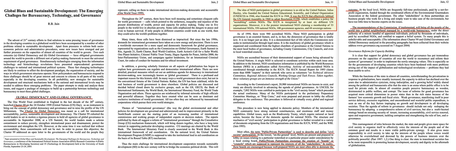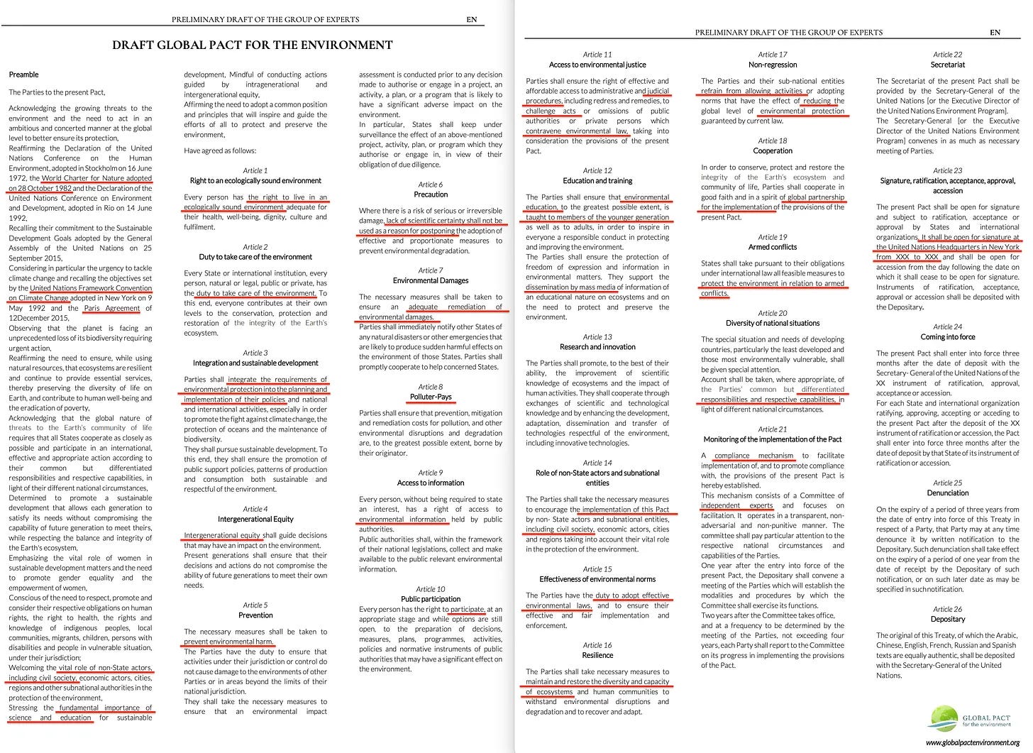 Και αυτό το έγγραφο της IUCN χρησίμευσε περαιτέρω ως εισροή για το «Σχέδιο Παγκόσμιου Συμφώνου για το Περιβάλλον» [26] από το 2017, μέσω του οποίου βλέπουμε... λοιπόν, ολόκληρη την αφήγηση στριμωγμένη σε μια πιθανή, μελλοντική νομικά δεσμευτική συνθήκη, που θα βασίζεται τελικά στον Παγκόσμιο Χάρτη για τη Φύση του 1982. Και αυτό πραγματικά δεν είναι ένα αστείο, αλλά ήταν ρητά ένα τέτοιο σύμφωνο το οποίο το Collegium International ζήτησε το 2002.