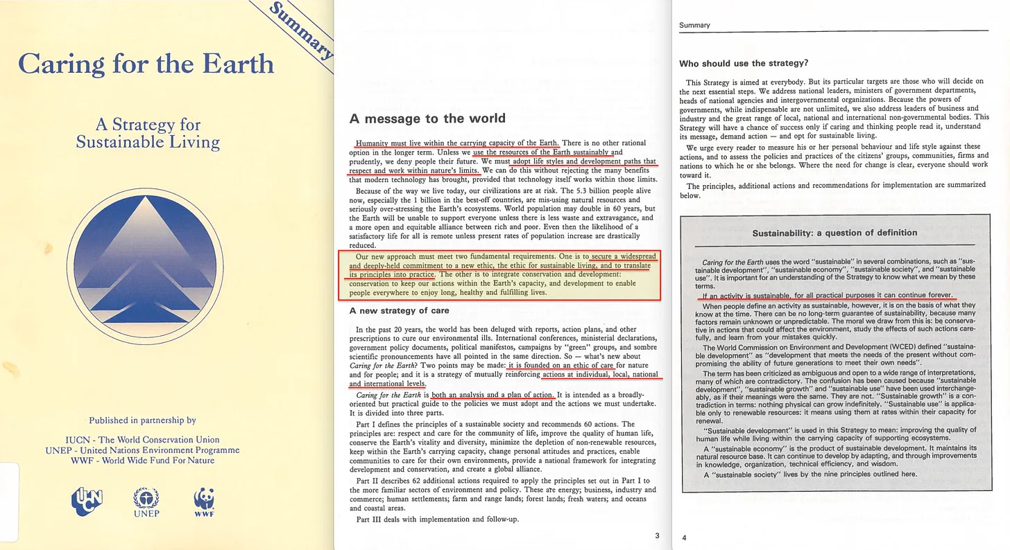Και αυτό μας οδηγεί βολικά στο «Caring for the Earth» της Διεθνούς Ένωσης για τη Διατήρηση της Φύσης, που δημοσιεύθηκε το 1991 [1], το οποίο ξεκινά με την παράδοση «ενός μηνύματος προς τον κόσμο».