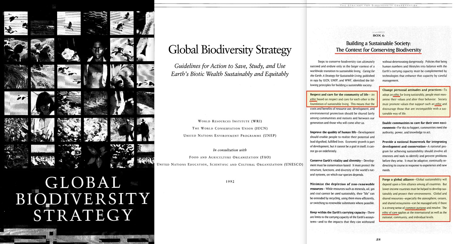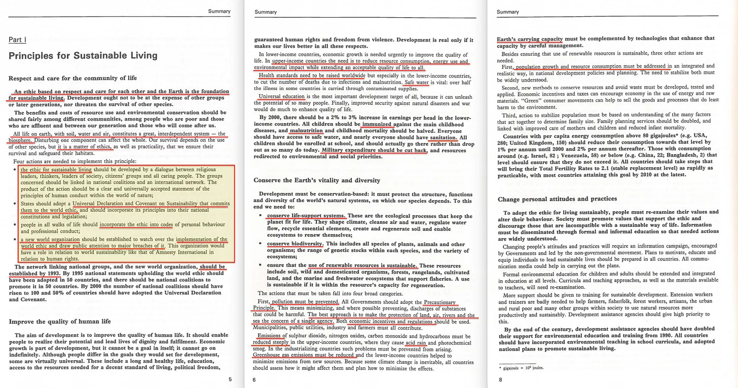 «Η πρώτη αρχή της Παγκόσμιας Στρατηγικής Διατήρησης είναι η ηθική επιταγή για «σεβασμό και φροντίδα της κοινότητας της ζωής». Όλες οι άλλες αρχές της στρατηγικής βασίζονται και απορρέουν από την πρώτη. Το επιχείρημα του Caring for the Earth, λοιπόν, είναι ότι ένα καθολικά κοινό σύνολο ηθικών αξιών είναι απαραίτητο αν η ανθρωπότητα θέλει να αντιμετωπίσει αποτελεσματικά τα οικονομικά, κοινωνικά και περιβαλλοντικά προβλήματα που αντιμετωπίζει ο σύγχρονος πολιτισμός».
