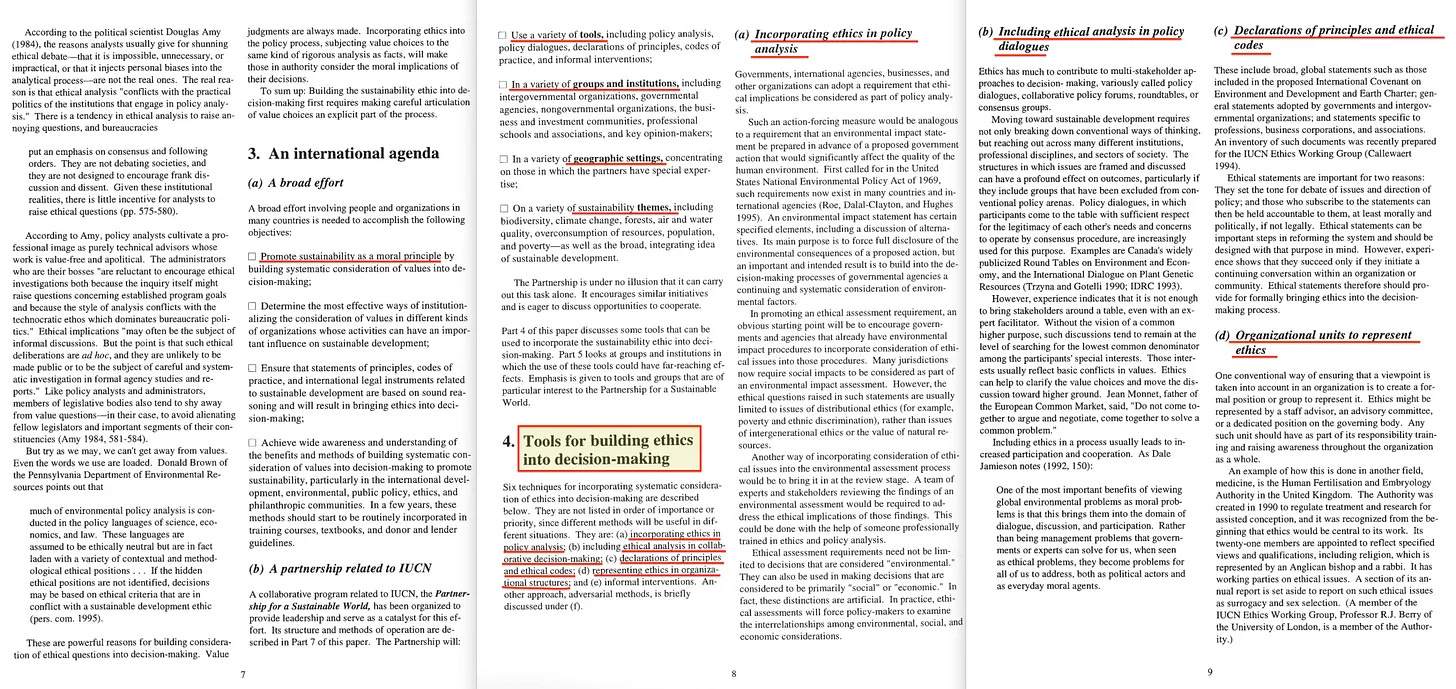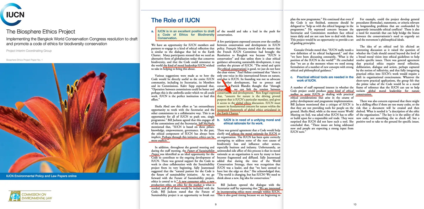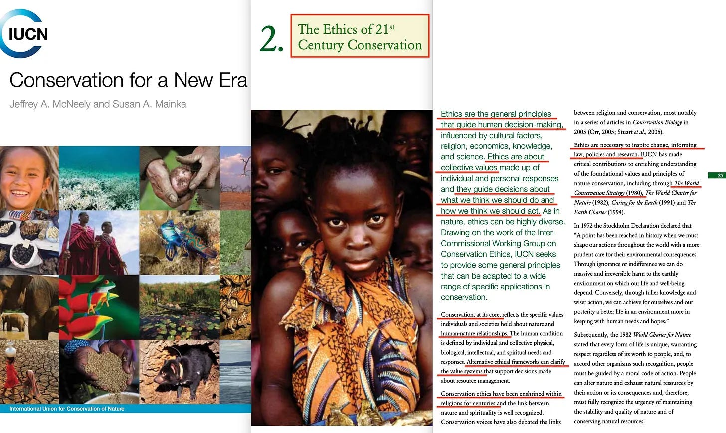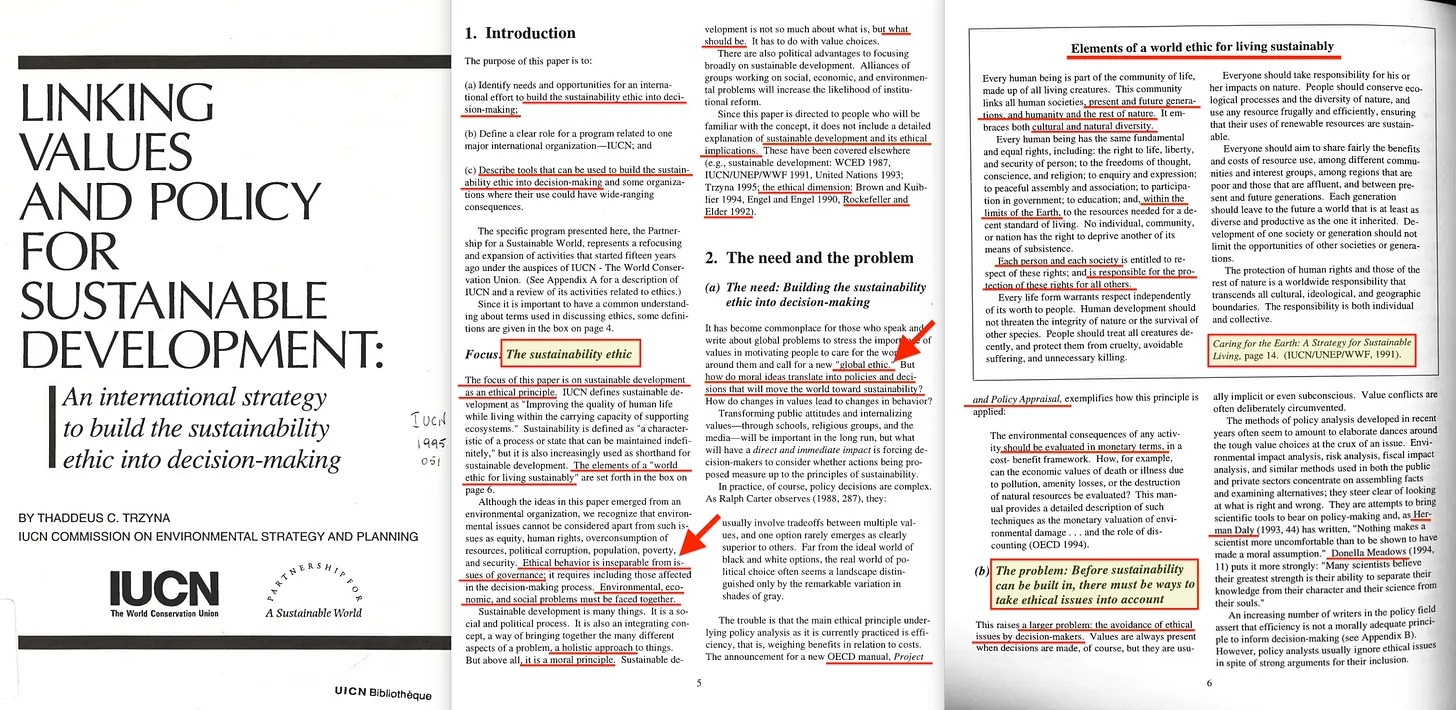 «Με βάση την εργασία μας για την ηθική στο πλαίσιο του Caring for the World: A Strategy for Sustainability (ο διάδοχος της Παγκόσμιας Στρατηγικής Διατήρησης, η οποία δημοσιεύθηκε το 1980), ζητήθηκε από την Ομάδα Εργασίας Ηθικής, Πολιτισμού και Διατήρησης της IUCN να συντάξει μια πρόταση για το πώς θα αναπτυχθούν οι ηθικές και πνευματικές διαστάσεις αυτού του προγράμματος...».