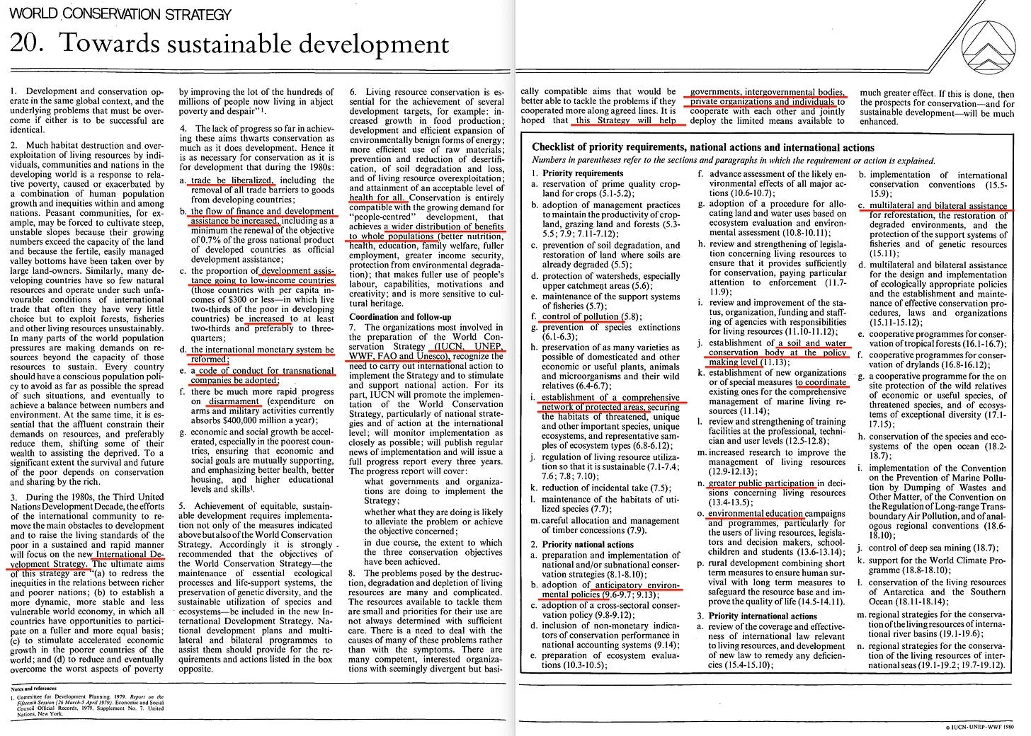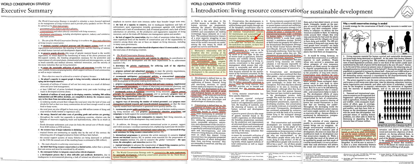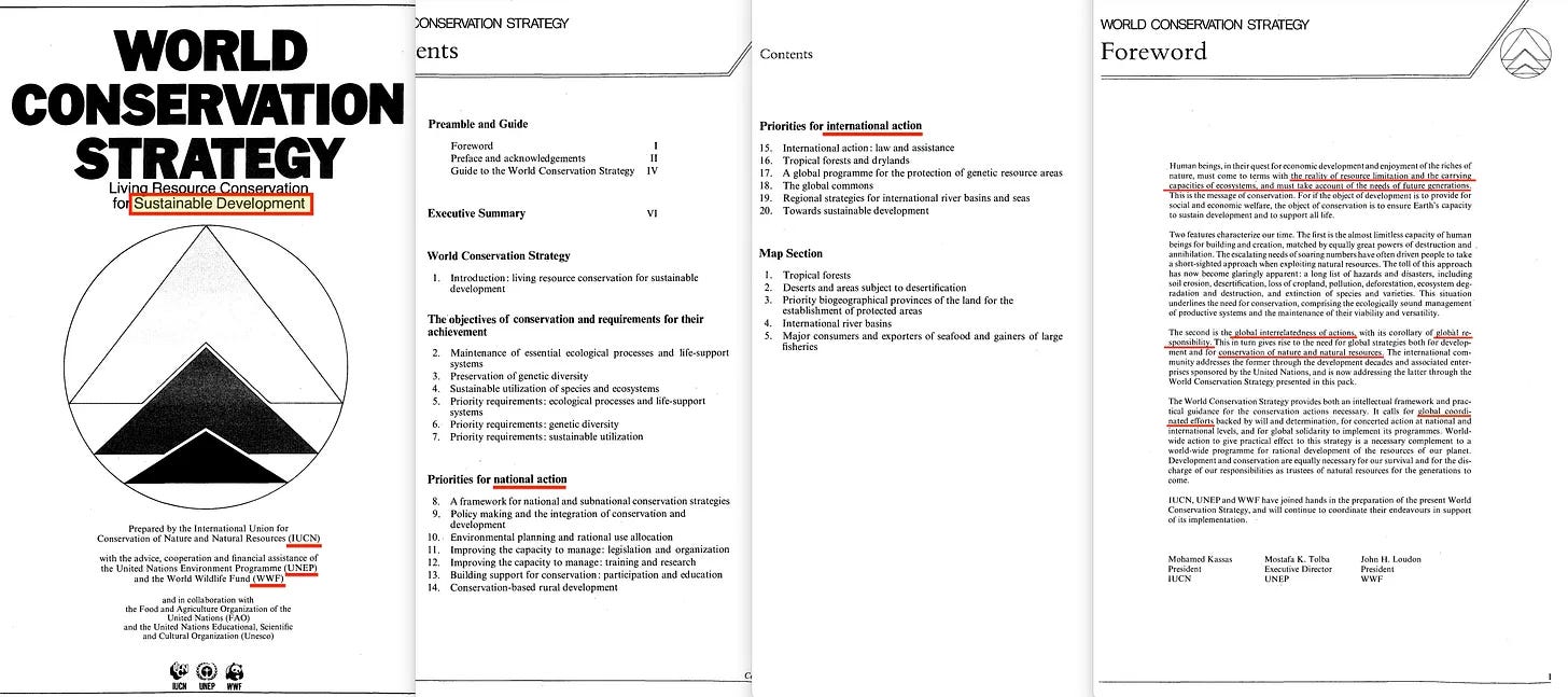 Αλλά, όπως είπαμε, ενώ η έκθεση αυτή μπορεί να έκλεψε τα πρωτοσέλιδα και να έλαβε όλη την προσοχή, η IUCN το 1980 είχε ήδη δημοσιεύσει την πρώτη της έκθεση για την αειφόρο ανάπτυξη - 7 ολόκληρα χρόνια πριν η Brundtland θέσει στο επίκεντρο τον όρο αυτό [2]. Ο τίτλος αυτής της έκθεσης είναι «Παγκόσμια Στρατηγική Διατήρησης - Διατήρηση των έμβιων πόρων για την αειφόρο ανάπτυξη» [3]. Και... είναι ένα εξαιρετικά στεγνό ανάγνωσμα. Αλλά είναι σημαντική, διότι αποτελεί το εναρκτήριο σάλπισμα στις πρακτικές πτυχές της διαχείρισης του πλανήτη.