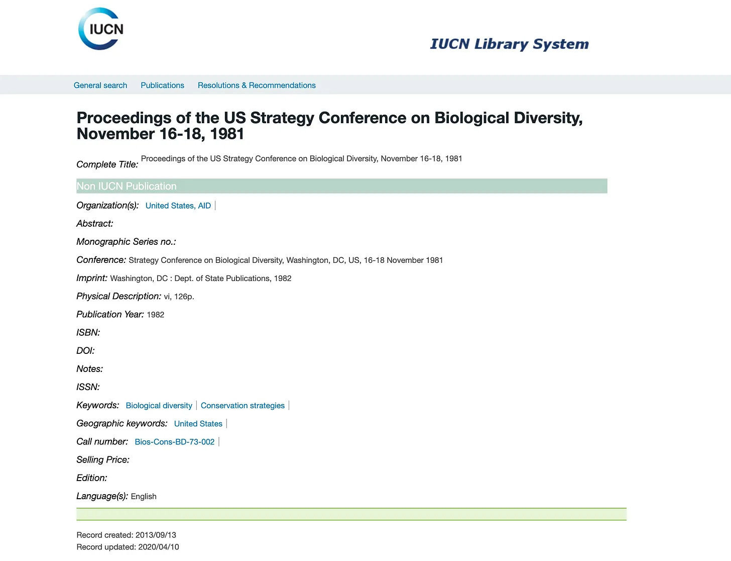 Και αυτό συνδέεται περαιτέρω με τη «Διάσκεψη Στρατηγικής των ΗΠΑ για τη Βιολογική Ποικιλότητα» της IUCN το 1981 [5], η οποία οδήγησε τελικά στη Σύμβαση για τη Βιολογική Ποικιλότητα.