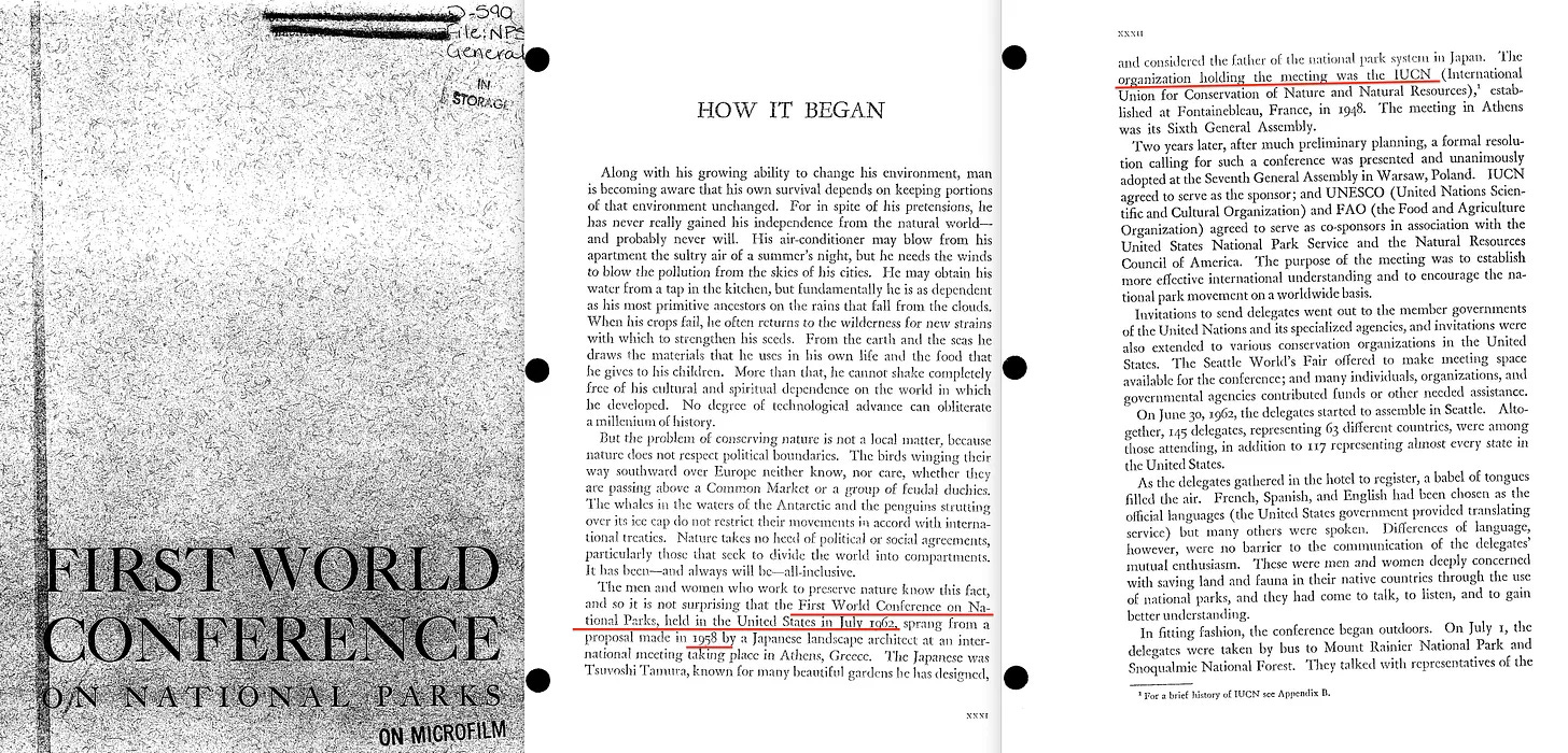 Το 1962 είχαμε την «Πρώτη Παγκόσμια Διάσκεψη για τα Εθνικά Πάρκα» [36] που διοργανώθηκε από την IUCN...