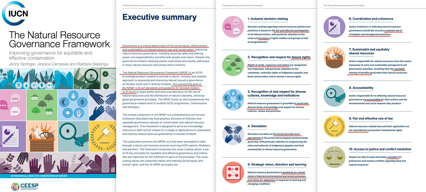 Η IUCN, με άλλα λόγια, είναι παντού πάνω στην Παγκόσμια Ηθική, την Προσέγγιση του Τοπίου, το Ολικό Ανθρώπινο Οικοσύστημα, τη Διατήρηση της Βιολογικής Ποικιλότητας, τον Παγκόσμιο Χάρτη για τη Φύση του 1982, τον κεντρικό σχεδιασμό... αλλά ας δούμε τι κάνουν στα σύγχρονα περιβάλλοντα και μετά ας επιστρέψουμε στις ρίζες τους. Ορίστε λοιπόν το 2021 «Το πλαίσιο διακυβέρνησης των φυσικών πόρων» [22] -
