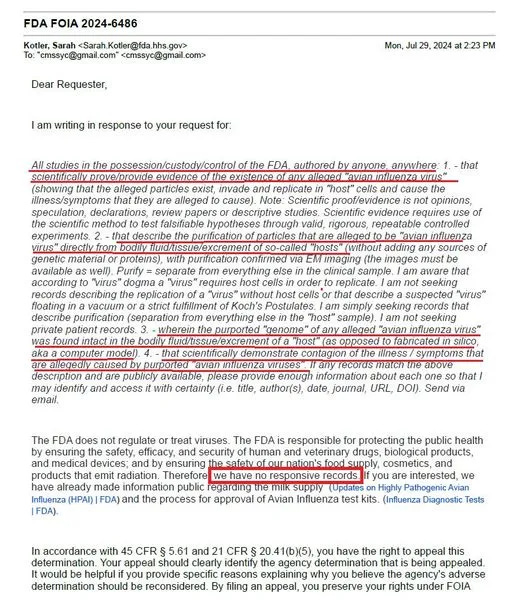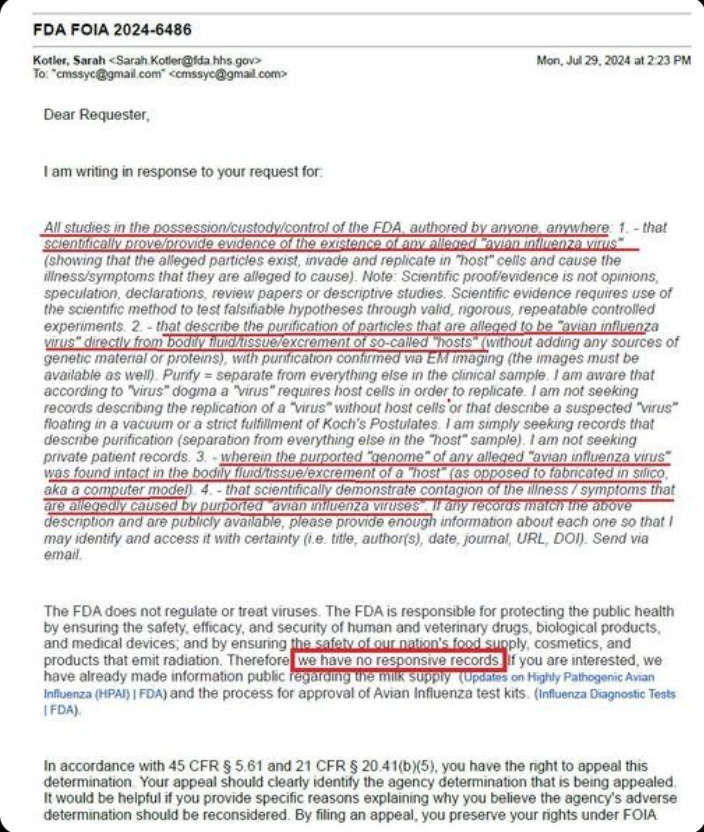 FDA confesses: zero scientific evidence of "avian influenza virus" or contagion... not even a "genome" found by anyone... anywhere