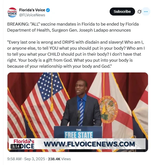 Στο πλαίσιο των πρωτοβουλιών MAHA της Florida, ο Γενικός Χειρουργός της Florida, Joseph Ladapo ανακοίνωσε τον τερματισμό ΟΛΩΝ των εντολών εμβολίων στην πολιτεία της Florida - ΟΛΩΝ ΑΝΕΞΑΙΡΕΤΩΣ - κατά τη διάρκεια μιας επικής ομιλίας. (Βίντεο διάρκειας 2 λεπτών αναρτήθηκε στο τέλος του άρθρου).