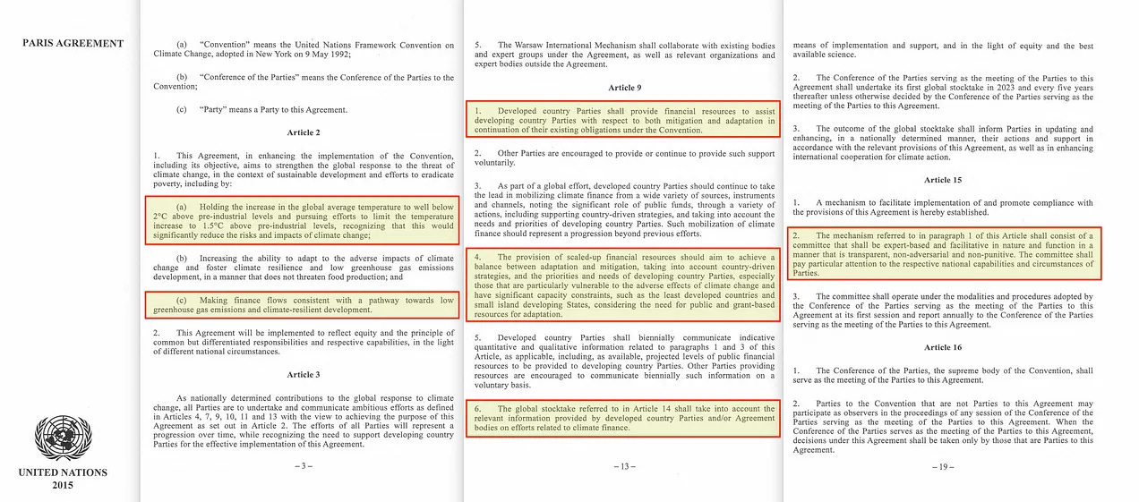 Η παγκόσμια συμφωνία-ορόσημο, με στόχο τον υποτιθέμενο περιορισμό της μελλοντικής αύξησης της παγκόσμιας θερμοκρασίας κάτω από τους 2 βαθμούς, υπογραμμίζει την ανάγκη για δισεκατομμύρια και δισεκατομμύρια και δισεκατομμύρια και δισεκατομμύρια κονδύλια, που συγκεντρώνονται στην πλάτη των δυτικών φορολογουμένων.