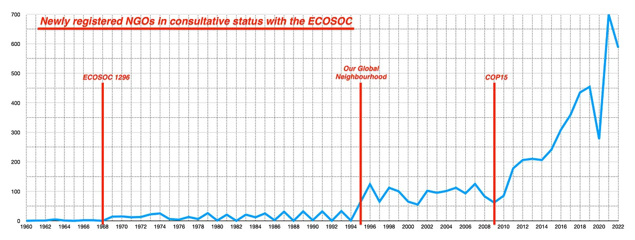 Και - παρεμπιπτόντως - αυτό είναι που έλαβε χώρα μετά την εν λόγω διάσκεψη. Ο αριθμός των ετήσιων εγγραφών των ΜΚΟ στο ECOSOC εκτοξεύθηκε [7] και σήμερα ανέρχεται σε 6.494.