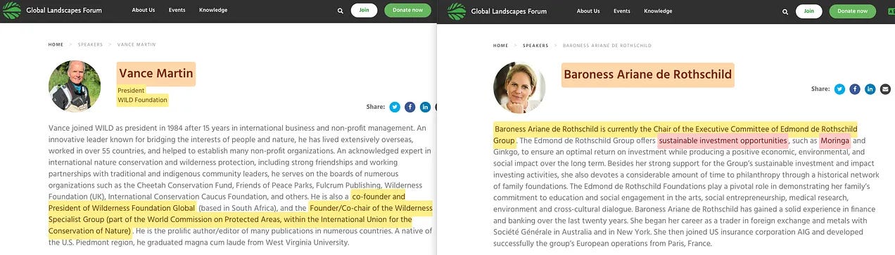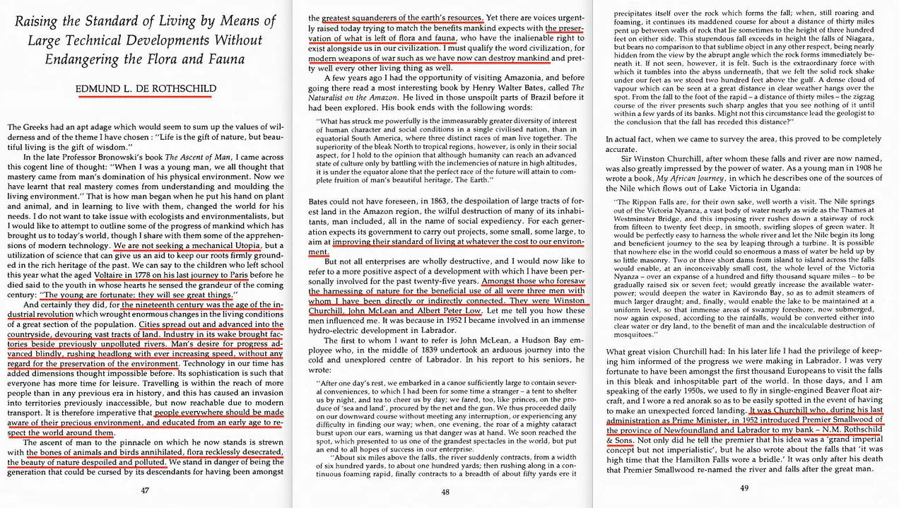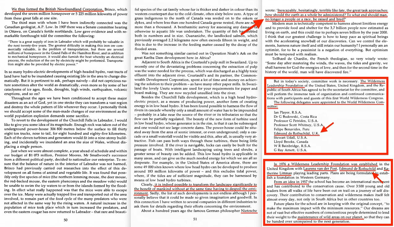 Αλλά αν πάμε ακόμη πιο πίσω στο χρόνο - στο 1977 για την ακρίβεια - θα διαπιστώσουμε ότι ο ίδιος ο Edmund de Rothschild συμμετείχε στο πρώτο Παγκόσμιο Συνέδριο για την Άγρια φύση, και μάλιστα πραγματοποίησε ομιλία50 , περιγράφοντας ακριβώς πόσο καταστροφικό είδος είναι η ανθρωπότητα. Είναι τα ίδια σκουπίδια που έχουμε δει επανειλημμένα να περιγράφονται.