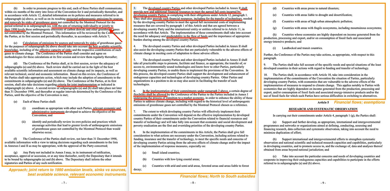 Το κύριο άρθρο που έχει σημασία στη σύμβαση-πλαίσιο του 1992 [1] είναι το άρθρο 4, το οποίο περιγράφει τις δεσμεύσεις των μερών και οι οποίες μπορούν σε γενικές γραμμές να περιγραφούν μέσα από τρία πεδία: τους στόχους, την προσέγγιση και τις χρηματοδοτικές ροές.