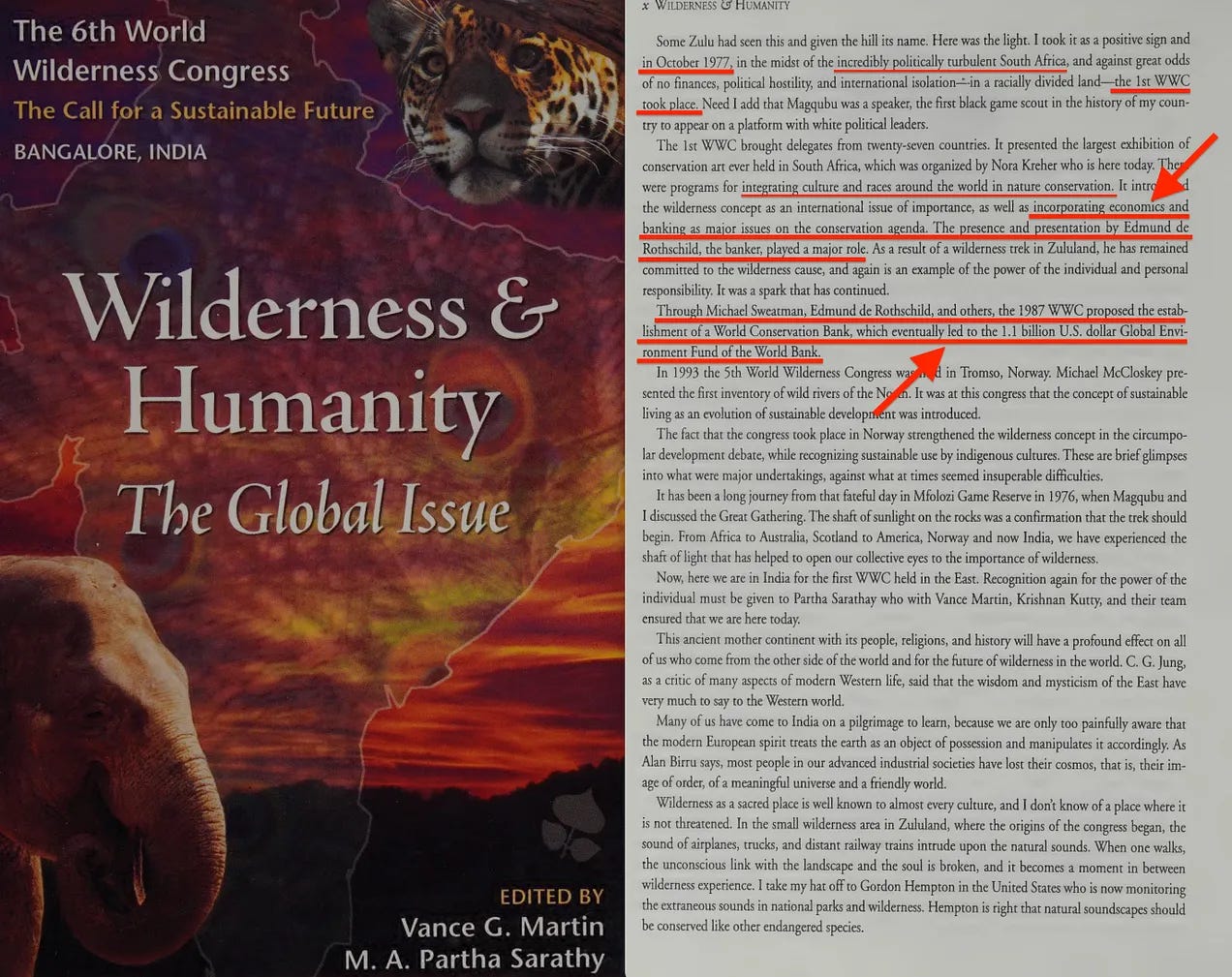 «Το πρώτο Παγκόσμιο Συνέδριο Άγριας Φύσης συγκέντρωσε αντιπροσώπους από είκοσι επτά χώρες... Εισήγαγε την έννοια της άγριας φύσης ως ένα σημαντικό διεθνές ζήτημα, καθώς και την ενσωμάτωση της οικονομίας και των τραπεζών ως μείζονα ζητήματα στην ατζέντα της διατήρησης. Η παρουσία και η παρουσίαση του τραπεζίτη Edmund de Rothschild έπαιξε σημαντικό ρόλο».