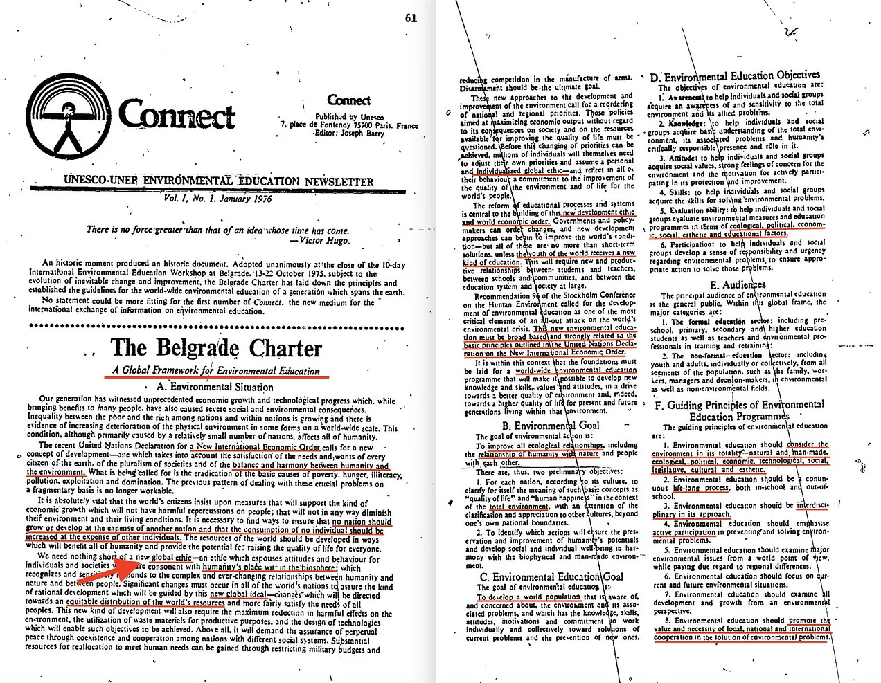Η επιτήρηση σε αυτό το στάδιο ήταν σε μεγάλο βαθμό έτοιμη και λειτουργούσε μέσω του GEMS. Και η εκπαιδευτική πτυχή συζητήθηκε ήδη από το 1975, μέσω της έκδοσης της Χάρτας του Βελιγραδίου [2] , η οποία περιέγραφε τη «δια βίου εκπαίδευση», μια «παγκόσμια ηθική» σχετικά με το παγκόσμιο περιβάλλον, τη «δίκαιη κατανομή των πόρων» και την υποχρεωτική έκκληση για «ισορροπία και αρμονία μεταξύ της ανθρωπότητας και του περιβάλλοντος», η οποία περιγράφηκε για πρώτη φορά από τα πρακτικά της Διάσκεψης της UNESCO για τη Βιόσφαιρα το 1968.