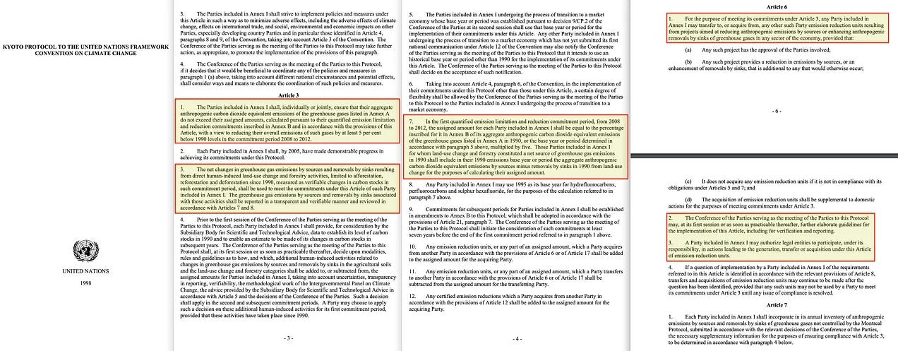 Το άρθρο 3 θέτει νομικά δεσμευτικούς στόχους μείωσης των εκπομπών, αλλά αυτοί είναι συνήθως μικροί και γενικά δεν θα έχουν μεγάλο αντίκτυπο από νωρίς. Ο στόχος είναι να νανουριστούν τα έθνη σε αυτούς τους μηχανισμούς και στη συνέχεια να σφίξουν τη θηλιά αργότερα.