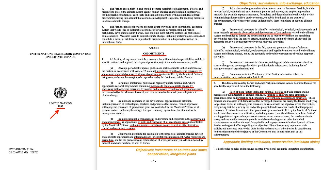 Αυτό στο οποίο θέλω να καταλήξω είναι ότι πέραν της μείωσης των εκπομπών, ήδη από το ιδρυτικό τους έγγραφο, η έμφαση δόθηκε στην αντιστάθμιση των εκπομπών. Μπορεί να μην το δήλωσαν ευθέως, αλλά η αναφορά των καταβόθρων έναντι των πηγών, όπου οι πρώτες θα πρέπει να διατηρηθούν, η ανάπτυξη σχετικών οικονομικών μέσων, και όλα αυτά που υπονοούν ότι θα πραγματοποιηθούν χρησιμοποιώντας αυτό που ουσιαστικά αποτελεί μια προσέγγιση του τοπίου, το καθιστούν απολύτως σαφές.