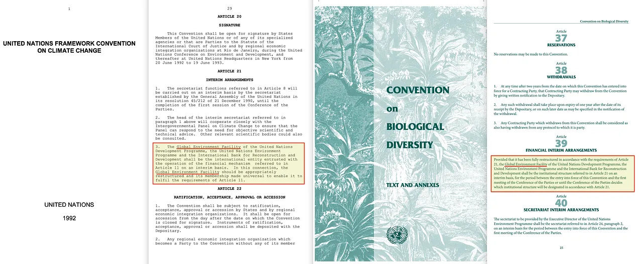 Και μέσω της σύμβασης του 1992 για τη βιολογική ποικιλομορφία, ισοδύναμο [47] - «Εφόσον έχει αναδιαρθρωθεί πλήρως σύμφωνα με τις απαιτήσεις του άρθρου 21, το Παγκόσμιο Περιβαλλοντικό Ταμείο του Προγράμματος Ανάπτυξης των Ηνωμένων Εθνών, του Προγράμματος Περιβάλλοντος των Ηνωμένων Εθνών και της Διεθνούς Τράπεζας Ανασυγκρότησης και Ανάπτυξης θα είναι η θεσμική δομή που αναφέρεται στο άρθρο 21 σε προσωρινή βάση».