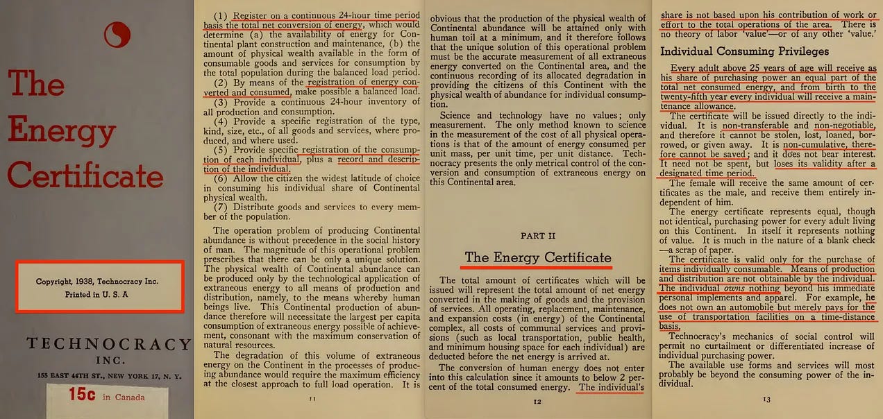 Και ξέρετε, ένα πολύ, πολύ παρόμοιο σύστημα περιγράφηκε το 1936, μέσω του «Ενεργειακού Πιστοποιητικού» [42] της Technocracy Inc - αν και με μια κάπως περιπαικτική... απήχηση...