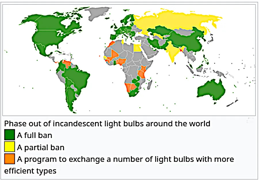 Ακολουθεί ένας παγκόσμιος χάρτης που δείχνει πού έχουν απαγορευτεί τα φώτα πυρακτώσεως παγκοσμίως. ...