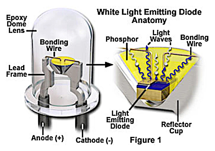 Ένα LED ή δίοδος εκπομπής φωτός είναι ένα ηλεκτρονικό στοιχείο που χρησιμοποιεί έναν ημιαγωγό για να εκπέμπει φως όταν το διαρρέει ρεύμα. Το χρώμα του φωτός (που αντιστοιχεί στην ενέργεια των φωτονίων) καθορίζεται από την ενέργεια που απαιτείται για να διανύσουν τα ηλεκτρόνια τον ημιαγωγό. Το λευκό φως επιτυγχάνεται με τη χρήση πολλαπλών ημιαγωγών ή ενός στρώματος φωσφόρου που εκπέμπει φως πάνω στη διάταξη ημιαγωγού.