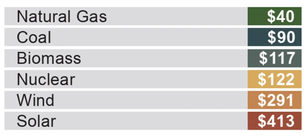 Τα ορυκτά καύσιμα είναι φθηνότερα, πιο αξιόπιστα και έχουν μεγαλύτερη ενεργειακή πυκνότητα από τις ανανεώσιμες πηγές ενέργειας. Τα συστημικά μέσα ενημέρωσης ισχυρίζονται τακτικά ότι οι ανανεώσιμες πηγές ενέργειας, όπως η αιολική και η ηλιακή, είναι φθηνότερες επειδή το «καύσιμό» τους –ο άνεμος και το φως του ήλιου– είναι δωρεάν. Αυτό είναι αλήθεια, αλλά σε μεγάλο βαθμό άσχετο. Η συλλογή αυτής της ενέργειας δεν είναι δωρεάν, ούτε καν κοντά σε αυτό. Ο πιο συνηθισμένος δείκτης για το κόστος των διαφορετικών πηγών ενέργειας είναι το Levelized Cost of Electricity (LCOE). Ωστόσο, η μέτρηση LCOE αγνοεί πολλά από τα σημαντικά κόστη που είναι μοναδικά για τις διαλείπουσες πηγές ενέργειας, όπως η αιολική και η ηλιακή. Αυτά περιλαμβάνουν ειδικές επιδοτήσεις που λαμβάνουν μόνο μέσω πιστώσεων ανανεώσιμων πηγών ενέργειας, το κόστος υποστήριξης της ενέργειας για τις περιπτώσεις που δεν φυσάει ο άνεμος και δεν λάμπει ο ήλιος, την υπερβολική κατασκευή και τα κόστη μεταφοράς σε απομακρυσμένες περιοχές.