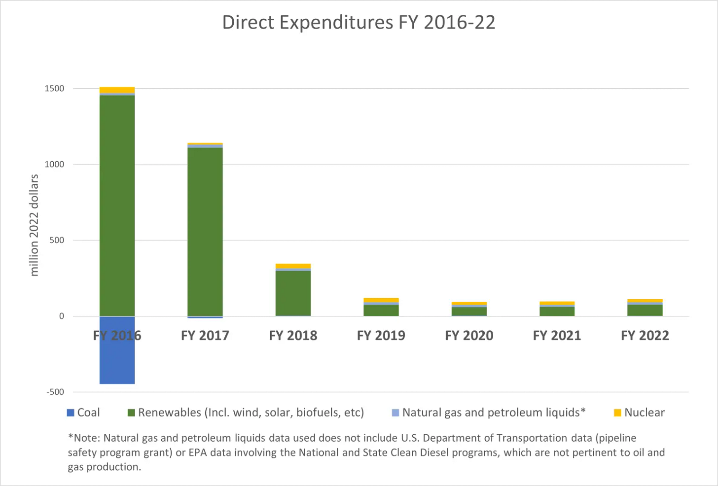 Σχήμα 2: Δεδομένα από την έκθεση της EIA «Ομοσπονδιακές χρηματοδοτικές παρεμβάσεις και επιδοτήσεις στον τομέα της ενέργειας κατά τα οικονομικά έτη 2016-2022», Πίνακας A6. Εκτιμήσεις άμεσων δαπανών για την ενέργεια, οικονομικά έτη (FY) 2016-22. https://www.eia.gov/analysis/requests/subsidy/pdf/subsidy