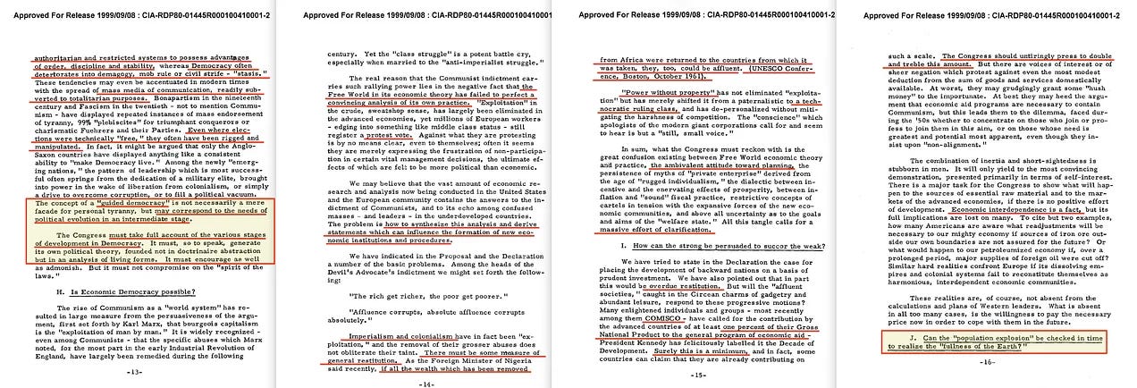 Ο Amory προώθησε αυτό το όραμα — γι’ αυτό δεν υπάρχει καμία αμφιβολία. Η συμμετοχή του αποδεικνύεται σαφώς από δύο εσωτερικά υπομνήματα με ημερομηνία 17 και 20 Νοεμβρίου 1961 [16]. Ο Arthur Schlesinger, Jr. ήταν επίσης απόλυτα σύμφωνος με την πρωτοβουλία. Και, όπως έχουμε ήδη δει, ο Schlesinger αργότερα παραποίησε τις γνώσεις του Amory σχετικά με την εισβολή στον Κόλπο των Χοίρων — και το έκανε σκόπιμα.