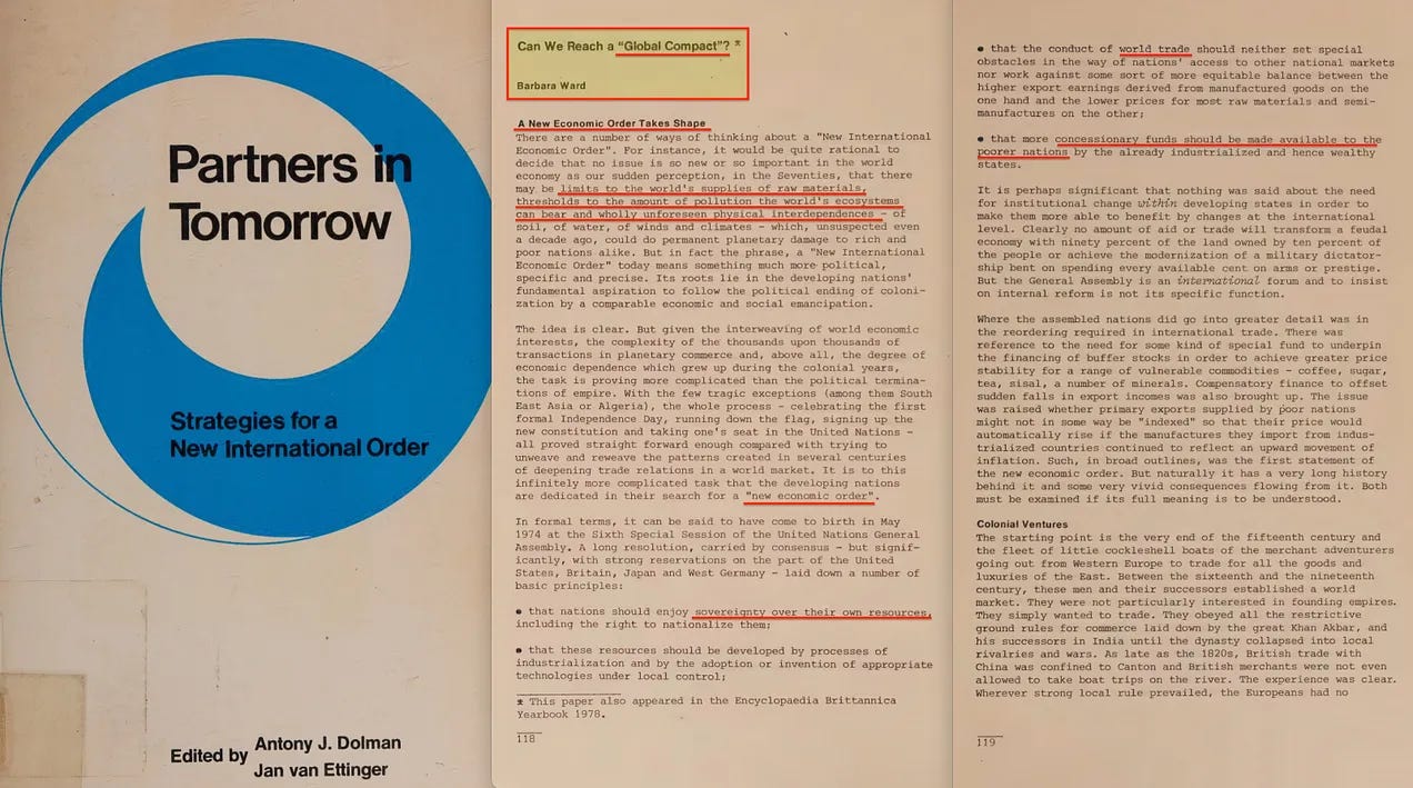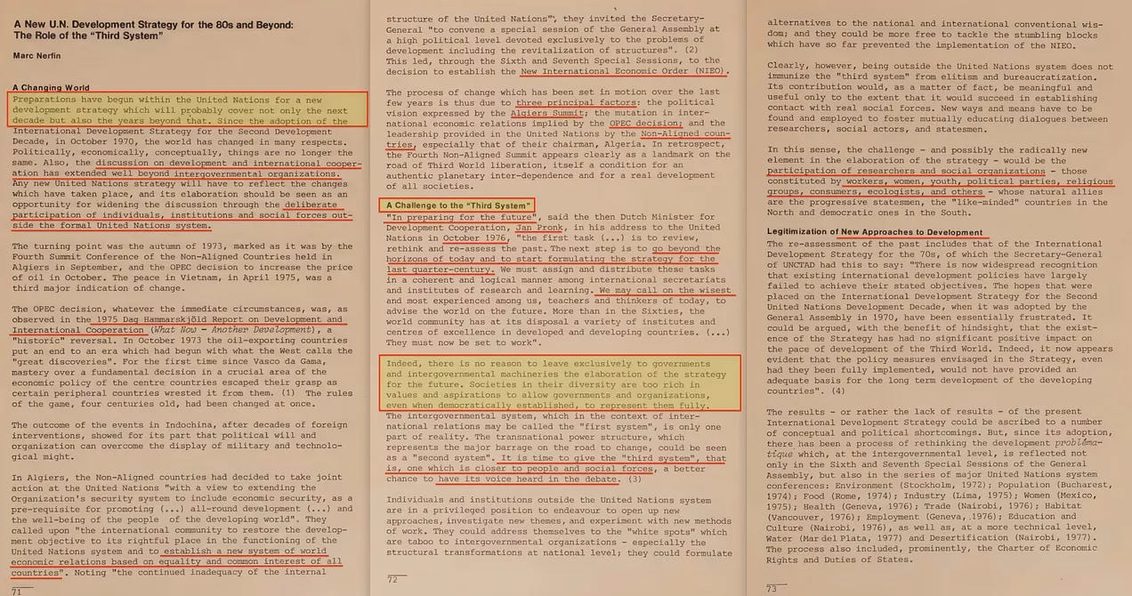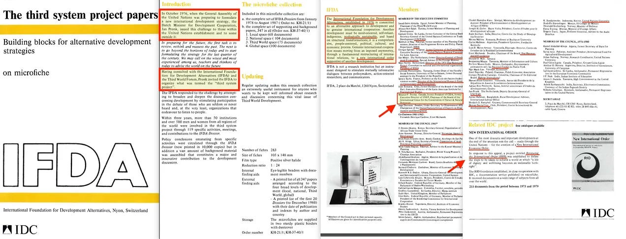 Αυτό το μοντέλο πολιτικής συμμετοχής θα επιταχυνόταν αργότερα μέσω του προγράμματος «Τρίτο Σύστημα» της IFDA στη δεκαετία του 1970 [8] — μια πρωτοβουλία που υποστήριξε άμεσα ο Maurice Strong. Μέσω αυτής της προσπάθειας, το έγγραφο «Partners of Tomorrow» (Συνεργάτες του Αύριο) ζήτησε για πρώτη φορά ένα «Παγκόσμιο Σύμφωνο», με την ιδέα να υποστηρίζεται από την Barbara Ward, γνωστή για την οπτική της «Διαστημόπλοιο Γη».