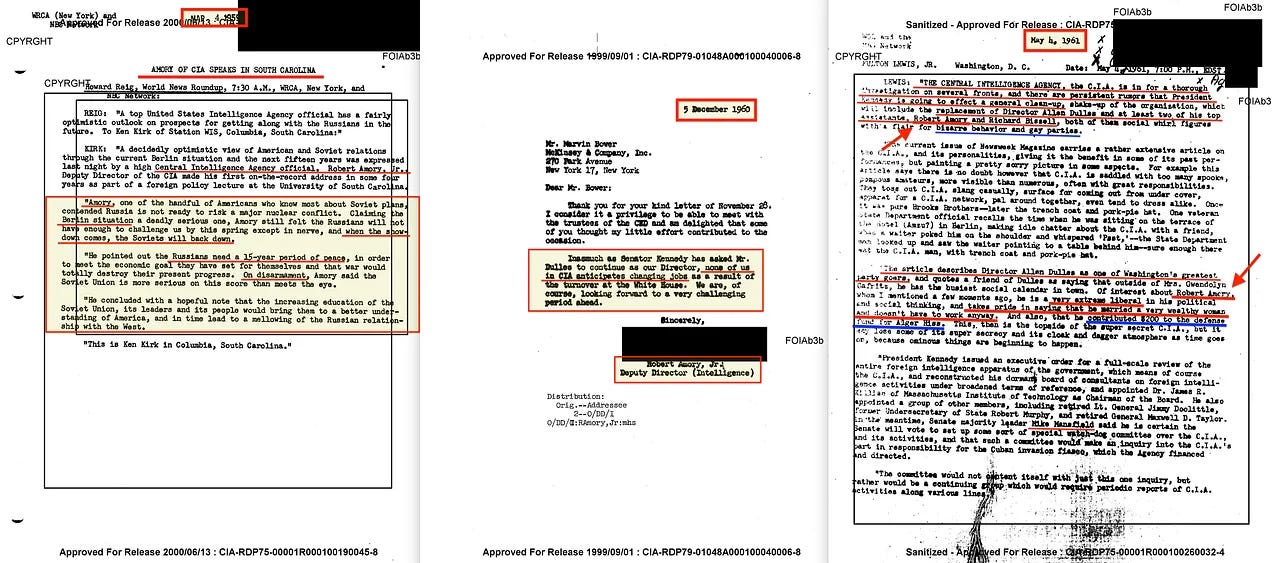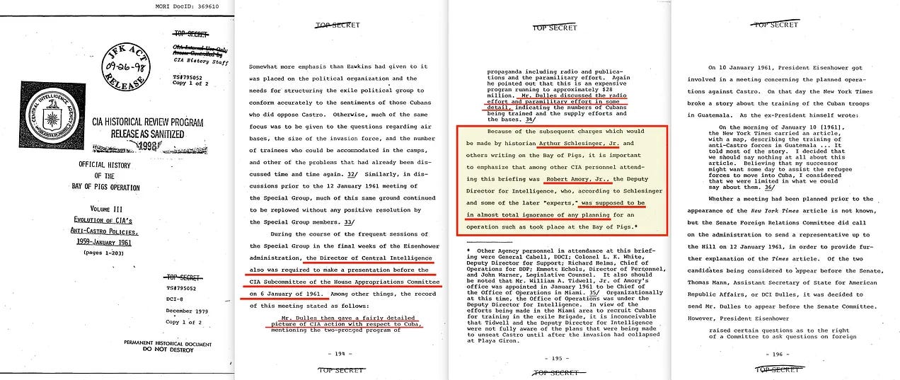 Η πρόσφατη αποχαρακτηρίωση των Εκτελεστικών Συνεδριάσεων της Επιτροπής Εξωτερικών Σχέσεων της Γερουσίας αποκάλυψε ότι ο Amory γνώριζε σίγουρα για το σχέδιο εισβολής από τις 11 Ιανουαρίου 1961, όταν συνόδευσε τον DCI Dulles στην ανεπίσημη ενημέρωση της Επιτροπής από τον Dulles.