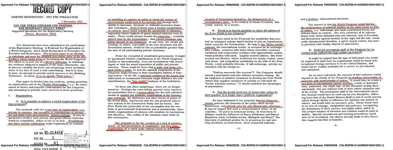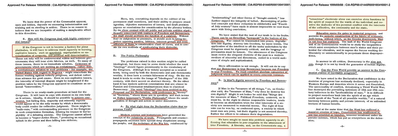 Αυτή είναι η συνέχεια του άρθρου «To Ourselves Be True» (Να είμαστε αληθινοί με τον εαυτό μας), που επικεντρώνεται στις εσωτερικές συζητήσεις γύρω από τη δημιουργία ενός Παγκόσμιου Συνεδρίου για την Ελευθερία και τη Δημοκρατία, με τον Robert Amory Jr. να διαδραματίζει ηγετικό ρόλο. Τόσο ο ίδιος όσο και ο Arthur Schlesinger Jr. υποστήριξαν την πρωτοβουλία, η οποία στην πράξη έθεσε τα θεμέλια για μια δομή που αντανακλούσε τις βασικές αρχές του κομμουνισμού. Αντιπροσώπευε, στην ουσία, έναν «Τρίτο Δρόμο»: μια σκόπιμη σύνθεση των κομμουνιστικών και καπιταλιστικών συστημάτων.