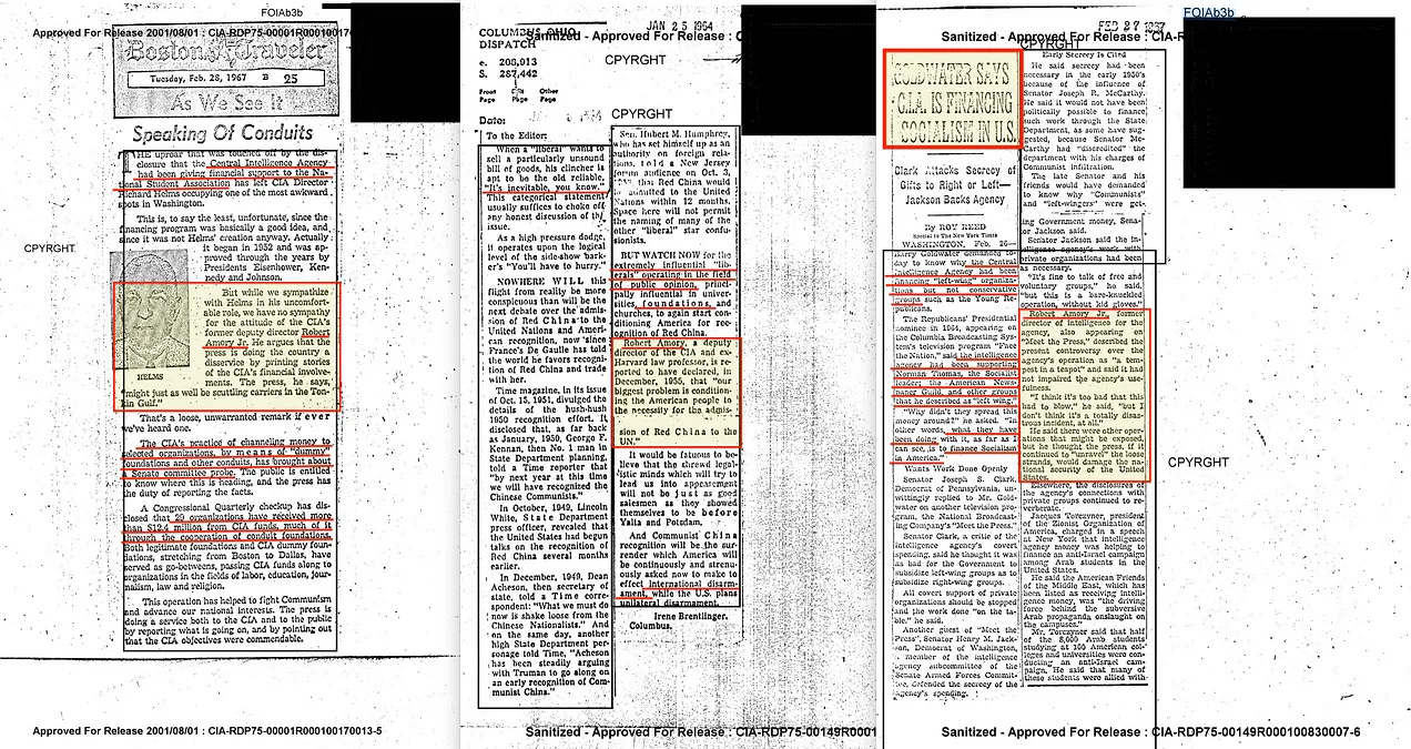 Ο Robert Amory υπερασπίστηκε επίσης πλήρως τη χρήση εικονικών ιδρυμάτων από τη CIA για τη διοχέτευση χρηματοδότησης σε προτιμώμενες οργανώσεις [18]. Όταν ο Barry Goldwater αποκάλυψε αργότερα ότι μέρος αυτών των κεφαλαίων είχε διατεθεί για τη χρηματοδότηση σοσιαλιστικών σκοπών [19], ο Amory υποστήριξε ότι το πραγματικό πρόβλημα δεν ήταν η χρηματοδότηση αυτή καθεαυτή, αλλά το γεγονός ότι είχε αποκαλυφθεί. Αυτή η στάση, φυσικά, δεν είναι εκπληκτική, δεδομένου του ευρύτερου ιστορικού του σε θέματα κατευνασμού — όχι μόνο απέναντι στη Σοβιετική Ένωση, αλλά και απέναντι στην κομμουνιστική Κίνα, την οποία είχε υποστηρίξει να γίνει μέλος των Ηνωμένων Εθνών από νωρίς [20].