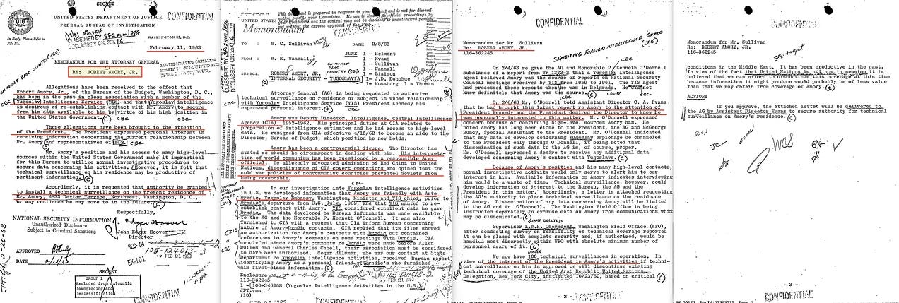 Όσον αφορά τις συχνά επαναλαμβανόμενες ισχυρισμούς για τη φιλία μεταξύ του Kennedy και του Amory , ένα έγγραφο τις διαψεύδει. Ένα έγγραφο του Υπουργείου Δικαιοσύνης με ημερομηνία 11 Φεβρουαρίου 1963 παρουσιάζει μια πολύ διαφορετική εικόνα. Αποκαλύπτει ότι ο Amory ήταν ύποπτος για διαβίβαση πληροφοριών στις γιουγκοσλαβικές μυστικές υπηρεσίες. Το θέμα τέθηκε απευθείας στον Πρόεδρο Kennedy, ο οποίος, αξιοσημείωτα, έδειξε προσωπικό ενδιαφέρον και εξουσιοδότησε την τεχνική παρακολούθηση της ιδιωτικής κατοικίας του Amory [17].