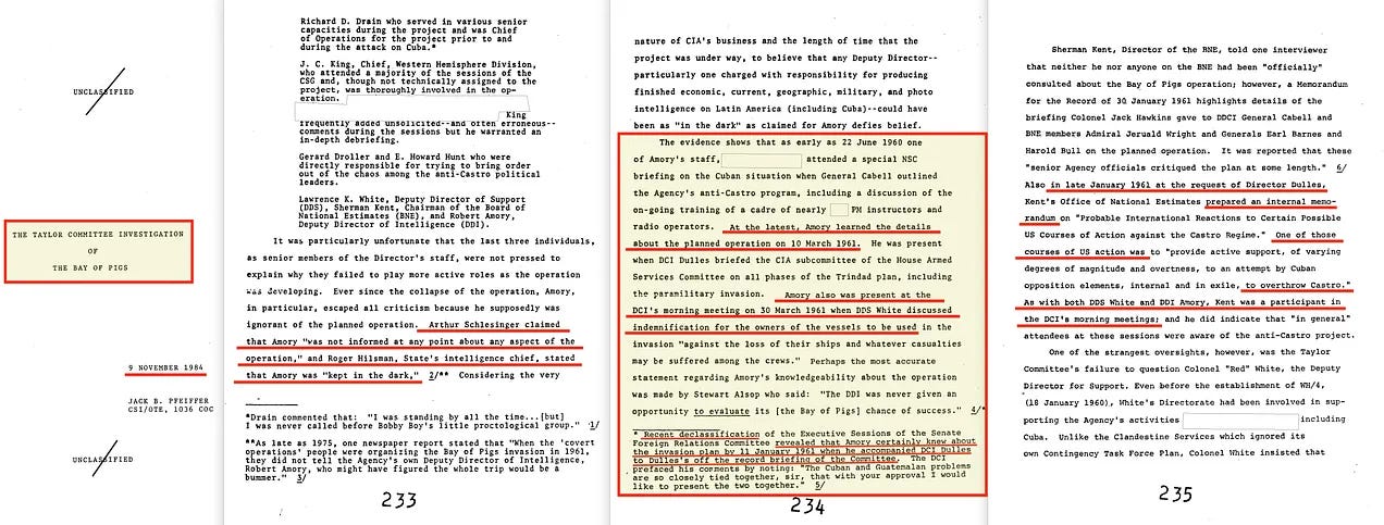 Στα τέλη Απριλίου 1962, ο Kennedy ανέθεσε στην Επιτροπή Taylor να διερευνήσει τι ακριβώς είχε συμβεί. Η CIA απέκρυψε την έκθεση για χρόνια, με μια δεύτερη απόπειρα δημοσίευσης να γίνεται το 1984 — ακόμα και τότε με πολλές διαγραφές [1]. Ωστόσο, το Κεφάλαιο 6 δεν αφήνει καμία αμφιβολία: