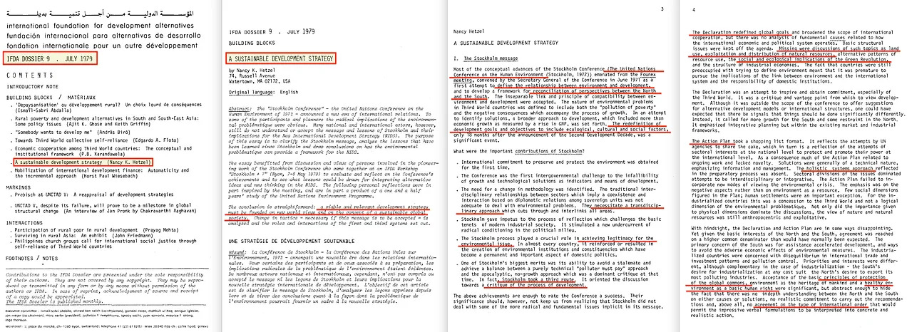 Παρεμπιπτόντως, η IFDA [9] ήταν επίσης η πρώτη που χρησιμοποίησε τον όρο «βιώσιμη ανάπτυξη». Ενώ η έκθεση Brundtland του 1987 είναι ευρέως γνωστή στο ευρύ κοινό, η Παγκόσμια Στρατηγική Διατήρησης του 1980 της IUCN την προηγήθηκε. Ωστόσο, εσωτερικά έγγραφα της IFDA αναφέρονταν ήδη στη βιώσιμη ανάπτυξη από το 1979 [10], σηματοδοτώντας την πραγματική προέλευση του όρου στους πολιτικούς κύκλους.