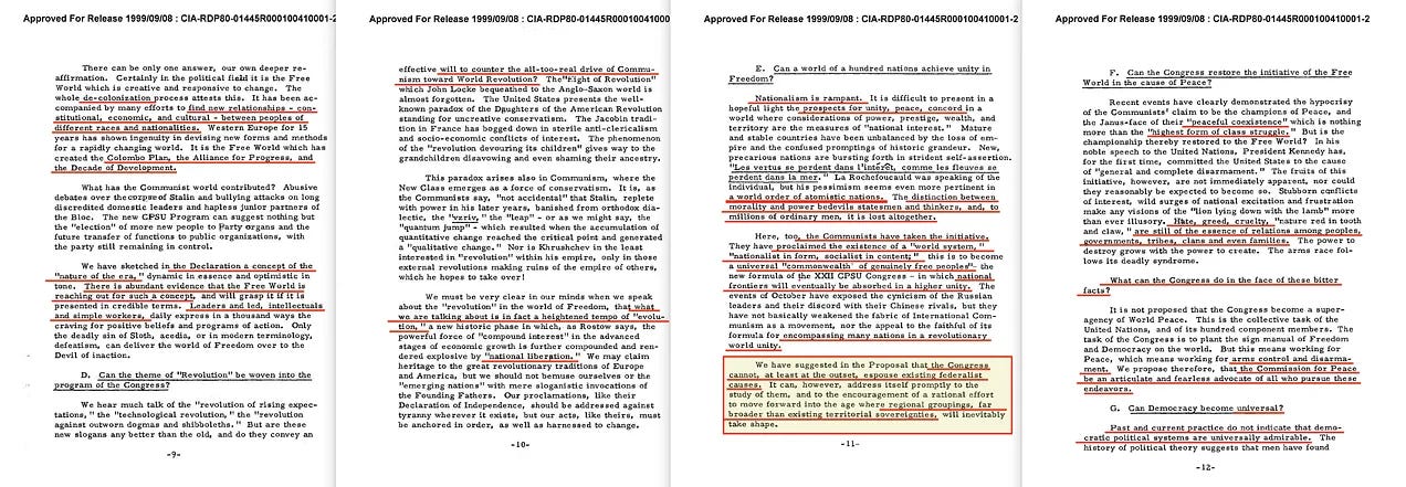 Η γλώσσα του είναι αδιαμφισβήτητη. Όροι όπως «διαλεκτική», «αποκατάσταση» και «καθοδηγούμενη δημοκρατία» σηματοδοτούν μια σαφή φιλοσοφική σύγκλιση με τη μαρξιστική θεωρία των συστημάτων. Το Κογκρέσο έχει ως αποστολή να συνθέσει τις αντίθετες πολιτικές δυνάμεις, να επιλύσει τη σύγκρουση του ατόμου με το συλλογικό και να διαμορφώσει μια νέα πολιτική συνείδηση — μια συνείδηση που ταιριάζει ανησυχητικά καλά με τους εσωτερικούς μηχανισμούς της κομμουνιστικής διακυβέρνησης. Ακόμη και η προσέγγιση της πρότασης για την εκπαίδευση, την ηθική και την πολιτική πληθυσμού δανείζεται άμεσα από τη λογική του κεντρικού σχεδιασμού, εκφράζοντας κολεκτιβιστικά ιδανικά με δυτικό φιλελεύθερο λεξιλόγιο. Οραματίζεται έναν μόνιμο μηχανισμό – «ένα παγκόσμιο λόμπι» – για τον συντονισμό της παγκόσμιας διακυβέρνησης μέσω αλληλεπικαλυπτόμενων θεσμών, λόμπι και επίλυσης συγκρούσεων υπό την διαχείριση της ελίτ.