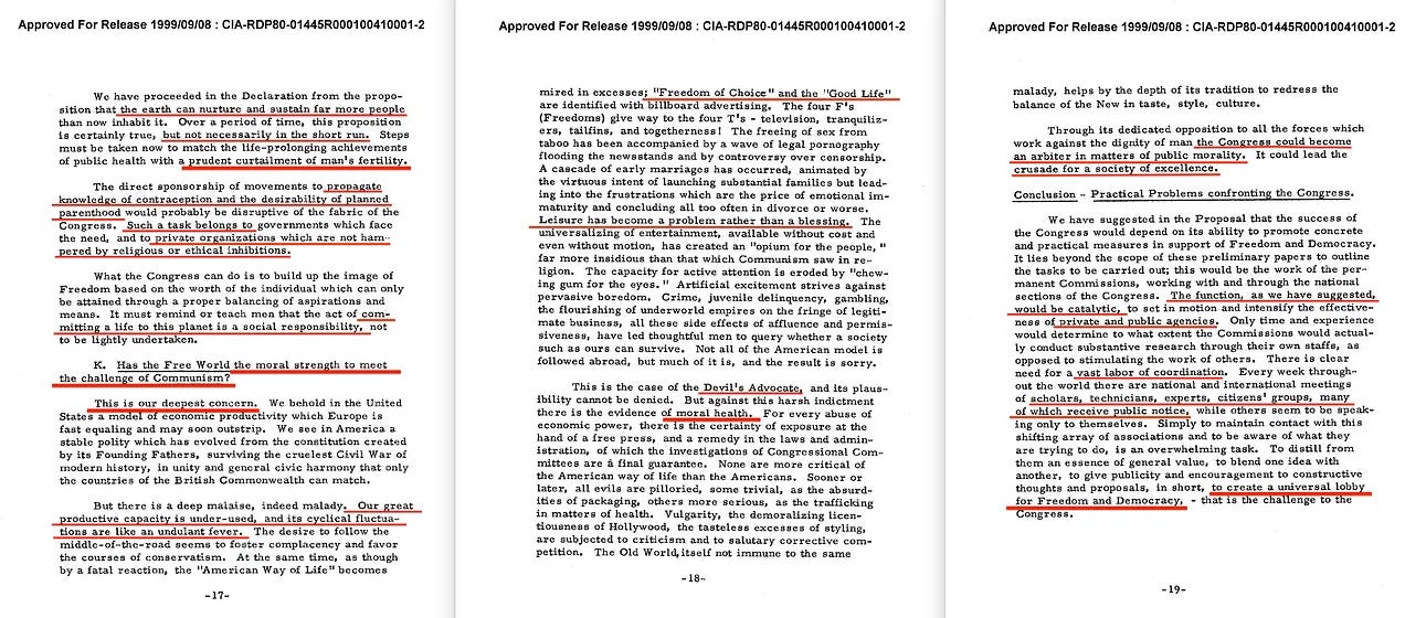 Αυτό το τρίτο έγγραφο προβλέπει τις πολιτικές και ιδεολογικές προκλήσεις που ενδέχεται να αντιμετωπίσει η πρωτοβουλία. Συνδέει ρητά το Συνέδριο με τη Δημόσια Φιλοσοφία του Walter Lippmann και πλαισιώνει το Παγκόσμιο Συνέδριο για την Ελευθερία και τη Δημοκρατία ως μια δημόσια-ιδιωτική επιχείρηση (ΣΔΙΤ). Είναι σημαντικό ότι θα χρηματοδοτηθεί από κυβερνήσεις —χωρίς όρους— με το σκεπτικό ότι «διαφορετικά τα ιδρύματα ενδέχεται να μην θέλουν να συνεισφέρουν». Τονίζεται η πλήρης ανεξαρτησία, ώστε «οι κομμουνιστές να μην εκμεταλλευτούν την υποψία κυβερνητικού ελέγχου».