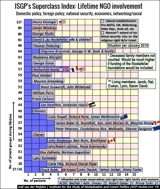 Εξετάζοντας τον δείκτη Superclass Index του ISGP για τους πιο συνδεδεμένους ελίτ συμμετέχοντες σε ΜΚΟ σε όλο τον κόσμο, είναι δυνατό να διαπιστωθεί ότι ορισμένοι think tanks και συνέδρια εκπροσωπούνται ιδιαίτερα συχνά μεταξύ των 60 κορυφαίων ατόμων το 2017 (στην πραγματικότητα 59), το έτος που πέθανε ο David Rockefeller. Ο κατάλογος: