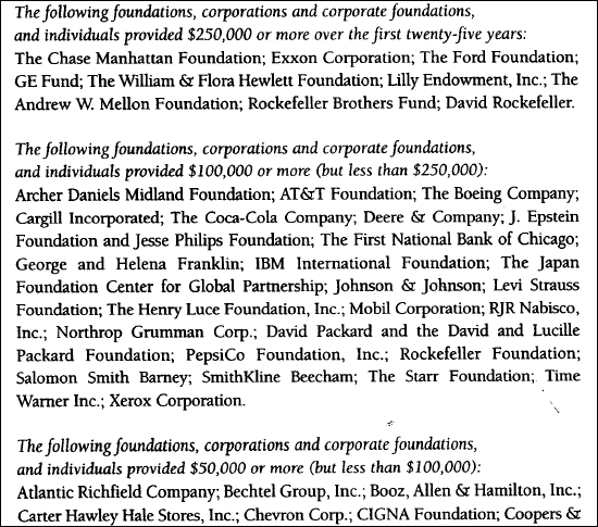 Ειρωνικά, ο μακροχρόνια προστατευόμενος «σειριακός παιδόφιλος και δανειστής» Jeffrey Epstein συνέχισε να εμφανίζεται ως σημαντικός χρηματοδότης της Τριμερούς Επιτροπής κατά τη δεκαετία του 1990 και του 2000. Η Enron, φυσικά, προκάλεσε ένα άλλο μεγάλο σκάνδαλο. Κοιτάζοντας τους χρηματοδότες, μπορούμε επίσης να θέσουμε κάποια ερωτήματα σχετικά με τις τραπεζικές πρακτικές, τις γεωργικές πρακτικές, τις διάφορες εγκρίσεις της FDA, την ποιότητα των τροφίμων μας και την ιστορική έλλειψη χρηματοδότησης για πολύ πραγματικές φυσικές λύσεις σε μια μεγάλη ποικιλία ασθενειών. Ωστόσο, αυτό δεν είναι το επίκεντρο αυτού του άρθρου, καθώς οι ίδιες εταιρείες και άλλες εμφανίζονται παντού στο δίκτυο των παγκοσμιοποιημένων think tank και συνεδρίων.