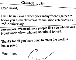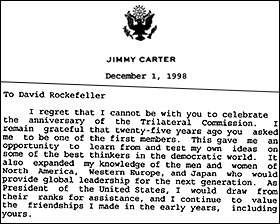 «Κανόνισα μια συνάντηση με τον Zbig [CFR '68-, διευθυντής 1972-1977]..., ο οποίος τότε δίδασκε στο Πανεπιστήμιο της Κολούμπια... τον Robert Bowie [CFR '47-'08] του Κέντρου Διεθνών Σπουδών του Χάρβαρντ, τον Henry Owen [CFR '66-] του Brookings Institution και τον McGeorge Bundy [CFR '48-; αδελφός του William Bundy: διευθυντής CFR '64-'74 και αρχισυντάκτης του περιοδικού Foreign Affairs του CFR '72-'84] του Ιδρύματος Ford, οι οποίοι ενέκριναν θερμά την πρότασή μου για τη δημιουργία μιας τριμερούς οργάνωσης. ...