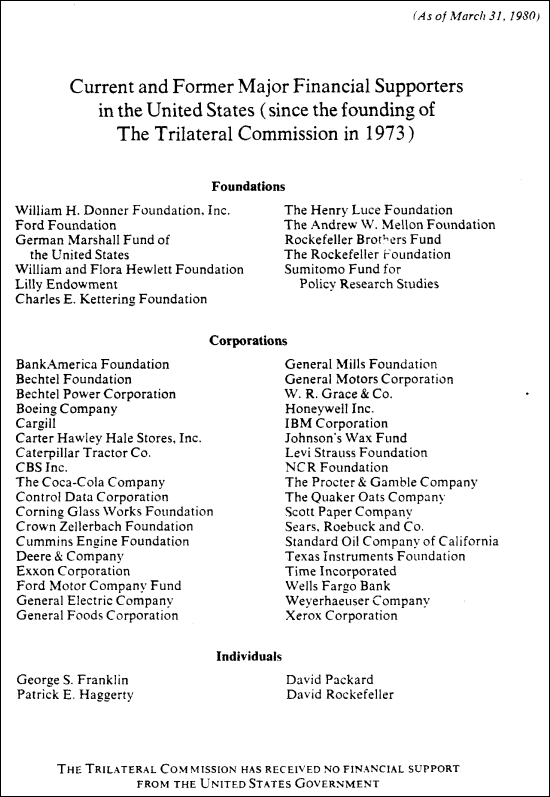 Όπως γίνεται πλέον κανόνας εδώ στο ISGP, η χρηματοδότηση μιας ΜΚΟ εξετάζεται πολύ νωρίς. Στην περίπτωση της Τριμερούς Επιτροπής, πρόκειται για το ίδιο ακριβώς εταιρικό δίκτυο με το CFR, το Bilderberg και κυριολεκτικά εκατοντάδες άλλες, αλληλεπικαλυπτόμενες ελίτ think tanks και συνέδρια που είναι διασκορπισμένα σε όλο τον κόσμο σήμερα. Από τη Διάσκεψη για την Ασφάλεια του Μονάχου έως το Φόρουμ για την Ανάπτυξη της Κίνας, είναι πάντα οι μεγάλες πολυεθνικές που αναλαμβάνουν τα έξοδα, συμπληρωμένα από μια χούφτα ιδρύματα που προέρχονται από μεγάλες επιχειρήσεις. Σε ορισμένες περιπτώσεις, ειδικά με περιβαλλοντικές οργανώσεις και οργανώσεις αρωγής, μέρος της χρηματοδότησης παρέχεται και από διεθνείς κυβερνητικές υπηρεσίες. Το τελευταίο σίγουρα δεν ισχύει για την Τριμερή Επιτροπή. Στην πραγματικότητα, η ομάδα έχει δηλώσει ρητά ότι δεν δέχεται χρήματα από την κυβέρνηση. Κατά κάποιον τρόπο, αυτό υποτίθεται ότι βοηθά να επιβεβαιωθεί ότι είναι «ανεξάρτητη» από την κυβέρνηση, με τον ίδιο τρόπο που άλλες επικαλυπτόμενες ΜΚΟ διαφημίζουν ότι δεν δέχονται χρήματα από εταιρείες...