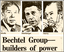 4 Ιουλίου 1982, Chicago Tribune, “Bechtel Group - builders of power”: "Ένας από τους άνδρες που ταξιδεύει σε μια λιμουζίνα της Bechtel είναι ο George P. Shultz [διευθυντής του CFR, Pilgrims], πρόεδρος της εταιρείας και επιλογή του προέδρου Reagan για να αντικαταστήσει τον υπουργό Εξωτερικών Alexander Haig [CFR, Pilgrims]. Η υποψηφιότητα του Shultz δημιούργησε αναστάτωση σε πολλούς υποστηρικτές του Ισραήλ και εστίασε ανεπιθύμητα τα φώτα της δημοσιότητας στον έντονα μυστικοπαθή όμιλο Bechtel, μια από τις μεγαλύτερες και λιγότερο γνωστές εταιρείες στον κόσμο. Ένας άλλος απόφοιτος της Bechtel είναι ο [πρώην αντιπρόεδρος της εταιρείας και νυν] υπουργός Άμυνας Caspar Weinberger. ... Πέρυσι η Bechtel εξαγόρασε έναν από τους παλαιότερους οικογενειακούς επενδυτικούς οίκους της Νέας Υόρκης, την Dillon, Read & Co. Inc., προσθέτοντας στον κατάλογο των στελεχών της τον C. Douglas Dillon [Pilgrims], υπουργό Οικονομικών στην κυβέρνηση Kennedy. ... Ο διευθυντής της CIA επί της εποχής του Nixon, Richard Helms [οικογένεια Pilgrims], χρημάτισε συχνός σύμβουλος της Bechtel, αν και εκπρόσωπος της εταιρείας δήλωσε ότι οι εργασίες του μειώθηκαν μετά την κατάληψη της αμερικανικής πρεσβείας στο Ιράν το 1979. Ο Helms είχε διατελέσει κάποτε πρεσβευτής στο Ιράν. .... Κάποτε ο John A. McCone, πρώην επικεφαλής της Επιτροπής Ατομικής Ενέργειας και διευθυντής της CIA, υπηρέτησε ως στέλεχος σε υποκατάστημα διυλιστηρίου πετρελαίου της Bechtel".