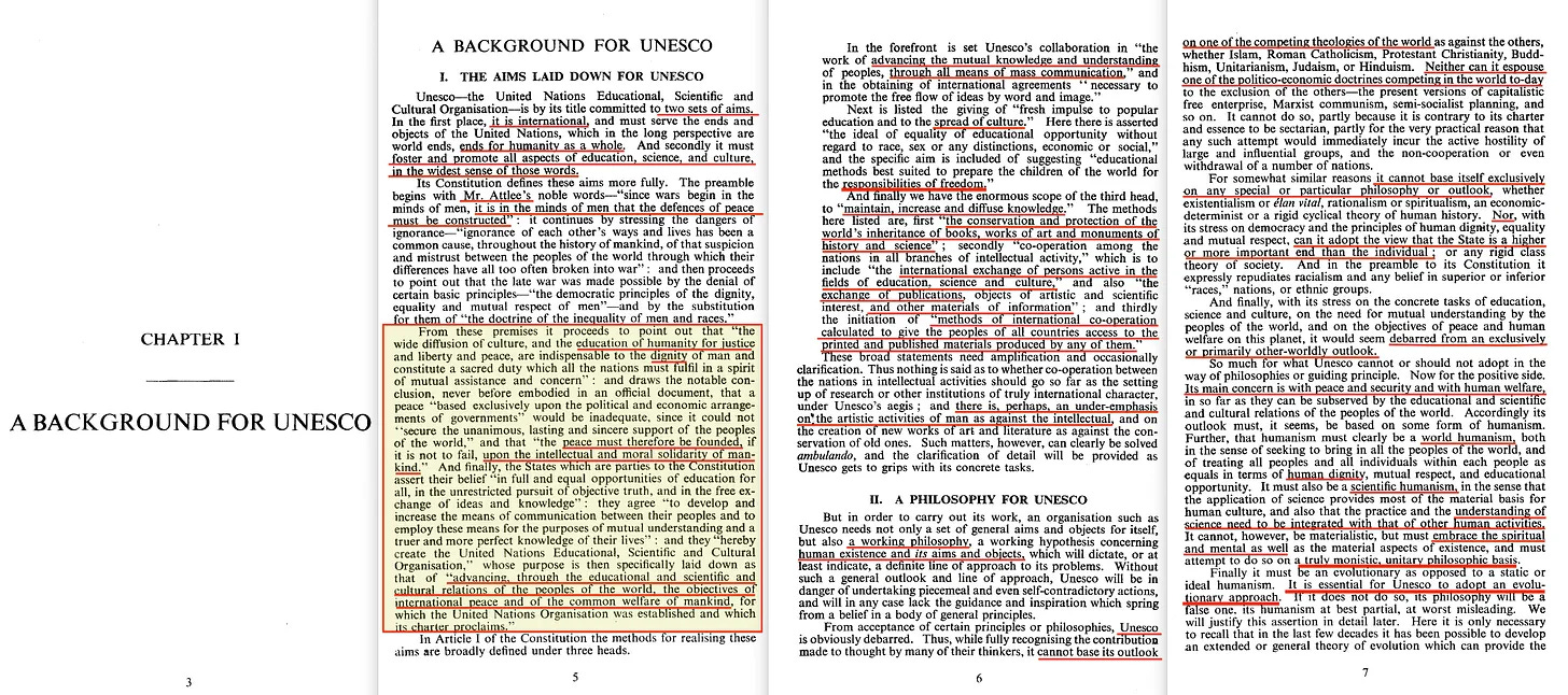 Αυτό που επιδιώκει η UNESCO είναι να «διορθώσει» τη στάση των ανθρώπων που δημιουργεί τις συνθήκες που οδηγούν στον πόλεμο. Και - βέβαια - αυτό ακούγεται καλό επιφανειακά. Αλλά... κάτι δεν μου κολλάει εδώ, διότι ο Clement Attlee ήταν σοσιαλιστής της Fabian [7] και το 1945 έγινε πρωθυπουργός του Ηνωμένου Βασιλείου [8].