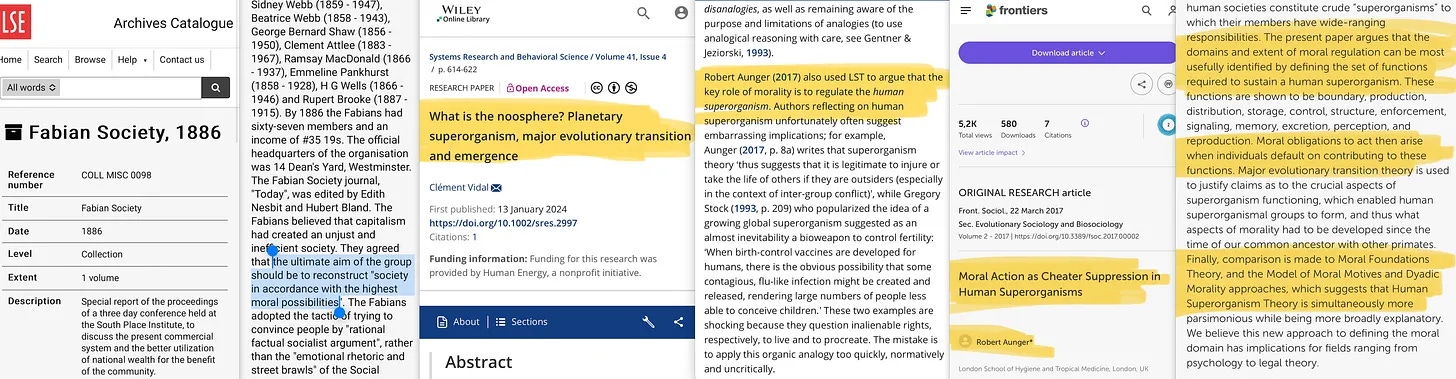 Η ανθρώπινη εξέλιξη διαμορφώνεται πρωτίστως μέσω της κοινωνίας - της κοινωνικής οργάνωσης - και πάλι, σε πλήρη συμφωνία με την Τεκτολογία του Bogdanov, η οποία τελικά αποδεικνύεται από τον Χάξλεϋ που απαγγέλλει στη συνέχεια μια ιεραρχία από τα άτομα στην κοινωνική οργάνωση. Αλλά καθώς ο Kenneth Boulding μόνο ιεραρχικά δομημένη Γενική Θεωρία Συστημάτων του Bertanalffy το 1956, δεν θα μπορούσε να είναι αυτή η πηγή. Έτσι, η έμπνευση εδώ θα πρέπει πιθανότατα να προήλθε από τον Herbert Spencer [21], τον Henri Bergson22, ή... ναι, τον Alexander Bogdanov [23].