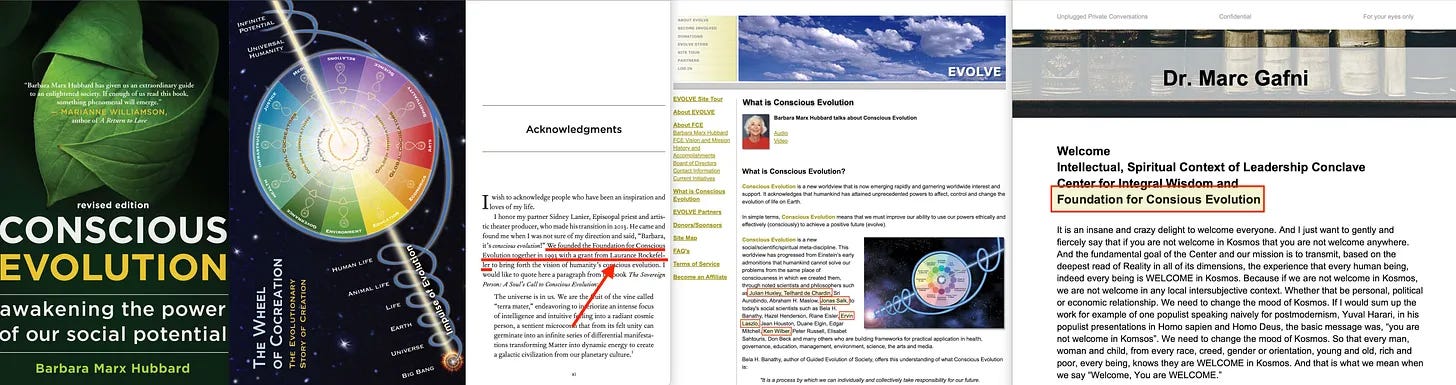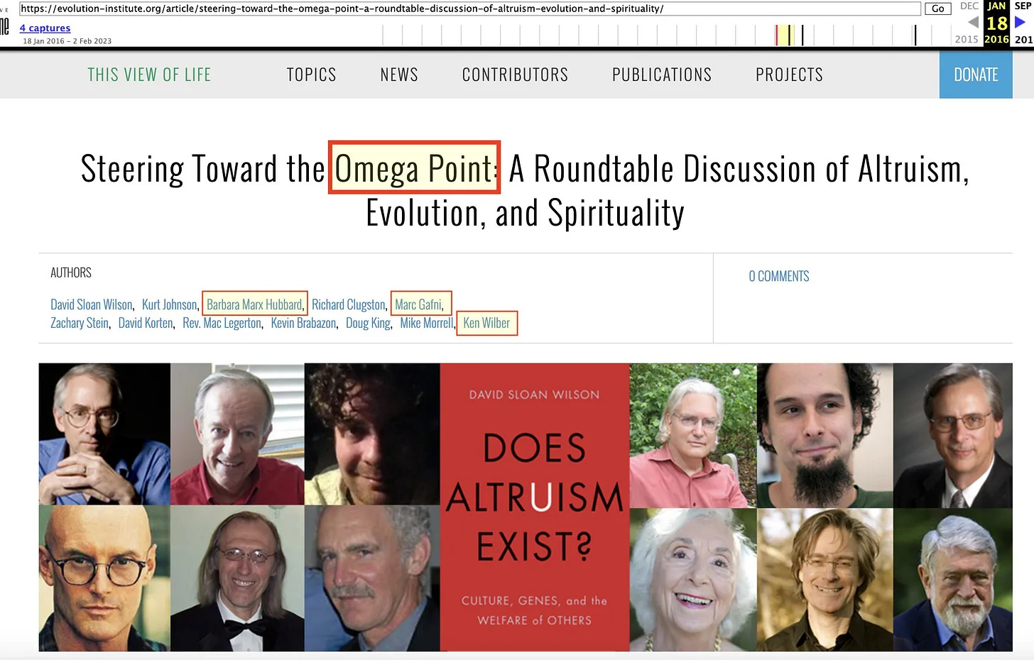 Η συμπερίληψη των Ινδουιστών Yogis είναι αξιοσημείωτη, αλλά καθώς δεν έχουμε συζητήσει ακόμα για τον Ken Wilber, θα πρέπει να περιμένει. Αλλά μη διστάσετε να διαβάσετε για τον Ολοκληρωτικό Μονισμό του Sri Aurobindo [31], τον οποίο ο Wilber σίγουρα γνωρίζει, και ο οποίος παρασύρει τον Hans Kung που αναφέρεται τακτικά στον Hans Jonas [32] στο πλαίσιο της Ολοκληρωμένης Οικολογίας... παρεμπιπτόντως, που επίσης εξετάζεται από τον Laudato Si. Ω... και εδώ είναι ο Wilber, συνοδευόμενος από την Barbara “Conscious Evolution” Marx Hubbard (που καλύπτεται παραπάνω) και τον Marc Gafni (Μοναδικός Εαυτός ως κύτταρο στον ανθρώπινο υπεροργανισμό), που συμμετέχουν σε συζήτηση με θέμα - ‘Steering Toward the Omega Point’ [33].