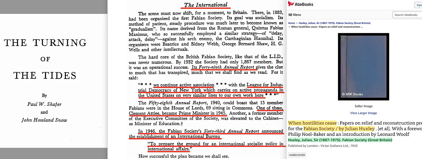 Έτσι, ένα απόσπασμα ενός σοσιαλιστή της Fabian βρίσκεται στο προοίμιο του καταστατικού της UNESCO, και η ίδια κοινωνία ίδρυσε ένα τμήμα, ειδικά για να ανοίξει το δρόμο για μια διεθνή σοσιαλιστική πολιτική... με τον εν ενεργεία πρωθυπουργό του Ηνωμένου Βασιλείου να είναι μέλος της εν λόγω κοινωνίας;;;;