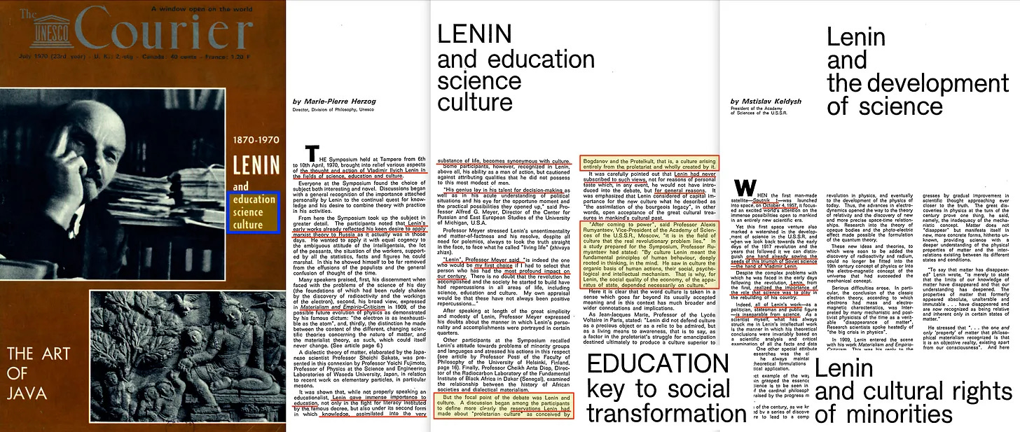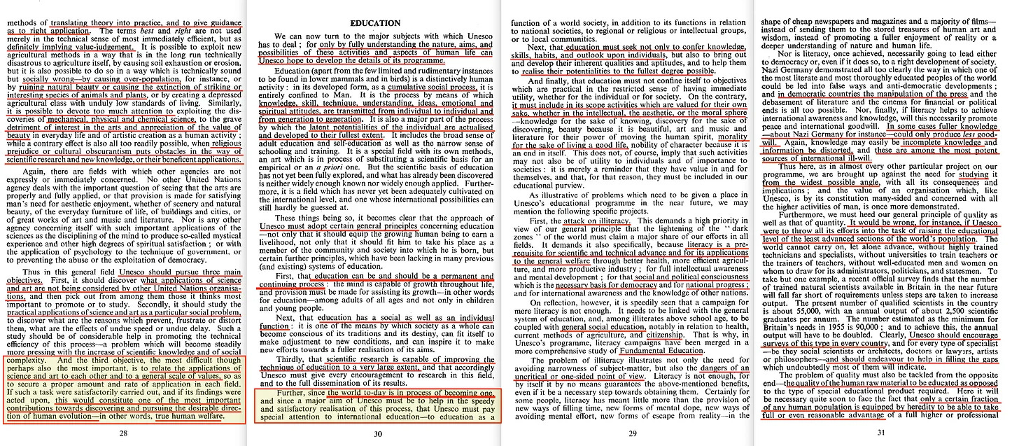 Τι ακριβώς λες εδώ, Huxley; Γιατί δεν νομίζω ότι κάποιος άλλος παρά μόνο ένας μανιακός κομμουνιστής θα μπορούσε να προβάλει αυτό το επιχείρημα. Αλλά όπως αποδεικνύεται, όποια και αν ήταν η πρόθεση του Huxley στην πραγματικότητα, η UNESCO εμφανίστηκε αργότερα πλήρως ευθυγραμμισμένη, δεδομένης αυτής της ειδικής έκδοσης του UNESCO Courier [24] από το 1970.