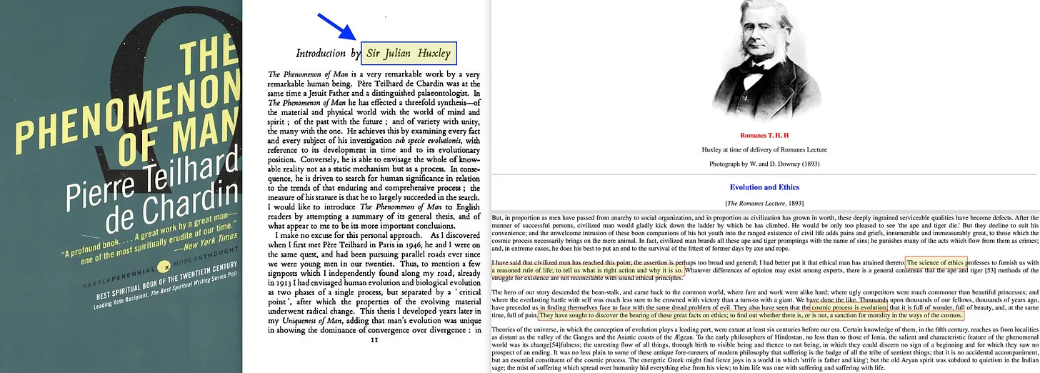 Αλλά ας αφήσουμε στην άκρη τον TH Huxley, γιατί στον πιο πνευματικό τομέα... ο Teilhard συνέθεσε την επιστήμη και τη θρησκεία μέσω της Εξελικτικής Ηθικής. Και σε κάτι που μπορεί να θεωρηθεί ως μια ακόμη εκπληκτική σύμπτωση... ο Julian Huxley έγραψε τον πρόλογο στο ίσως πιο διάσημο βιβλίο του Teilhard, «Το φαινόμενο του ανθρώπου» [19].