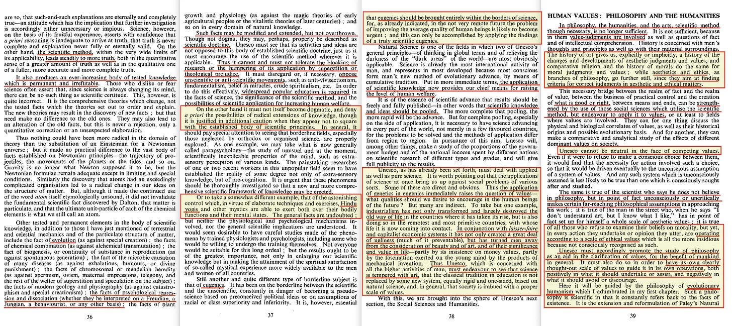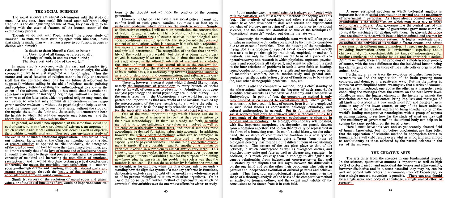 Ο Julian - κάπως πλούσια - μιλάει για θρησκευτικές προκαταλήψεις που σχετίζονται με την ελευθερία της επιστημονικής κατεύθυνσης, πριν δηλώσει ότι η UNESCO θα πρέπει να ασχοληθεί με την εφαρμογή της επιστήμης και της τέχνης, με το πώς αυτές σχετίζονται με την αντιμετώπιση συγκεκριμένων κοινωνικών προβλημάτων, και να συνδέσει αυτές τις εφαρμογές με μια γενική κλίμακα αξιών... που θα περίμενε κανείς να είναι εντελώς υποκειμενική, αλλά επιπλέον υποδηλώνει έναν προσεκτικό έλεγχο της επιστήμης και της τέχνης... με τον τρόπο που σχεδόν ρητά οραματιζόταν ο Bogdanov.